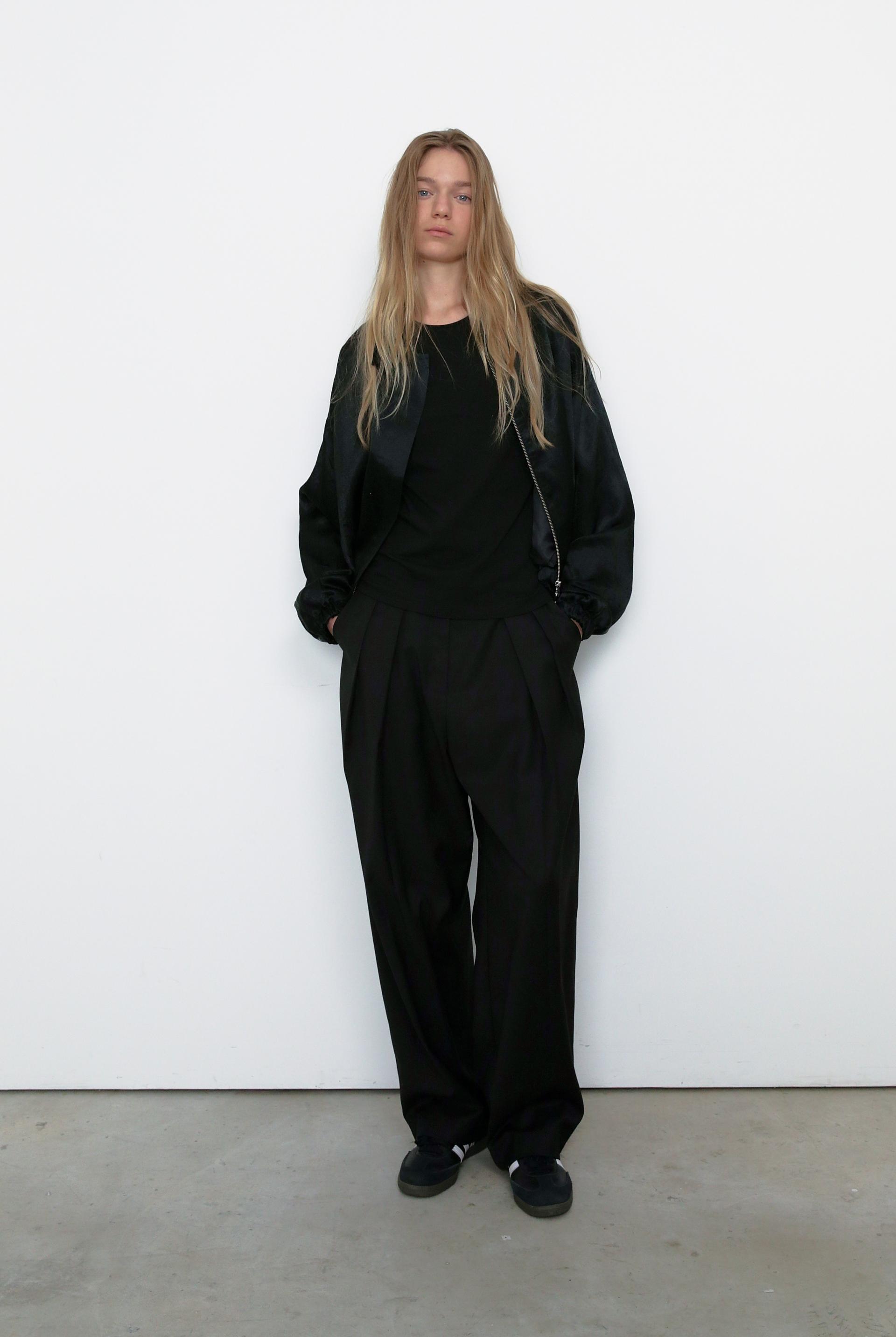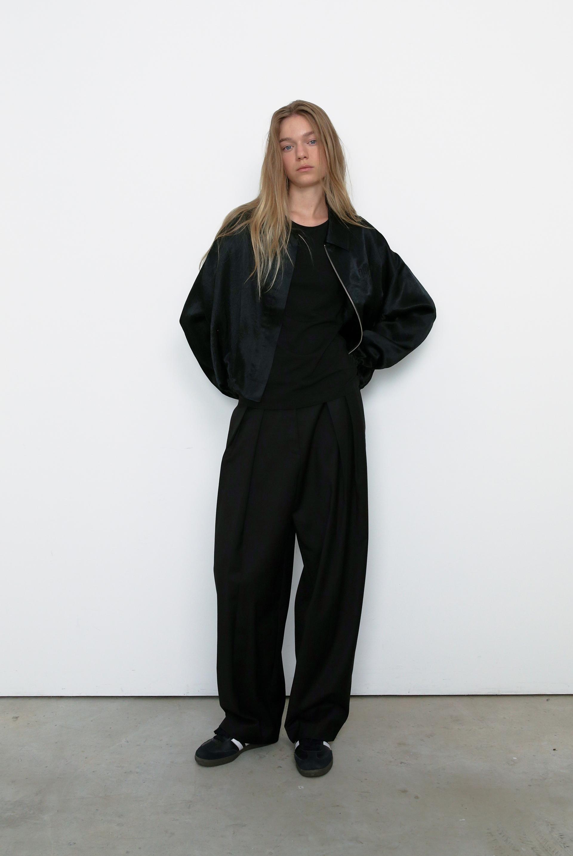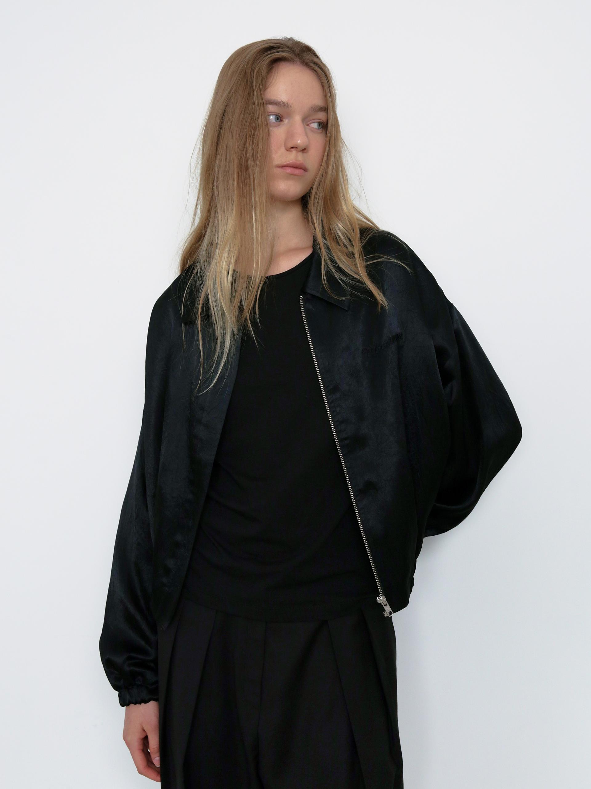 Elevate your wardrobe with the Glossy Satin Open Jacket in classic black — a refined piece featuring a soft, silky touch and a subtle glossy finish for a luxurious feel.