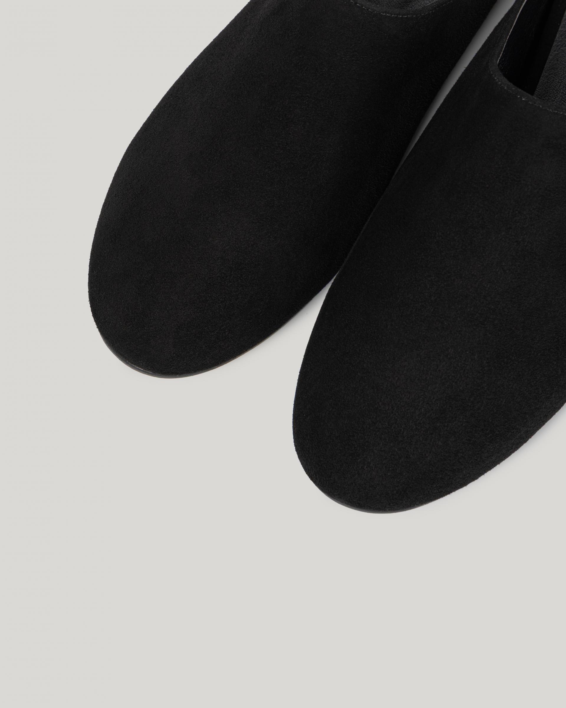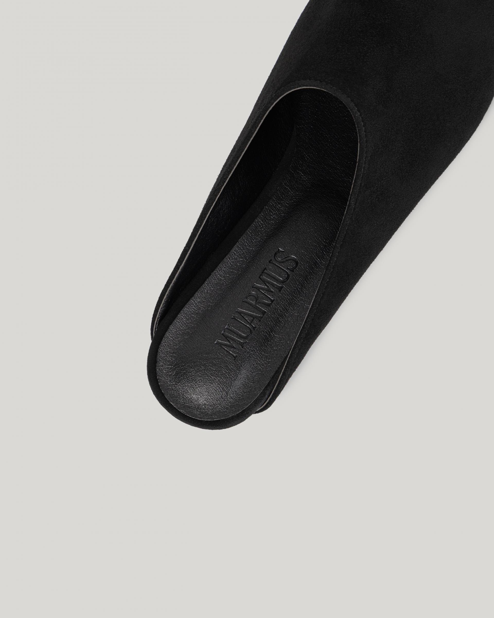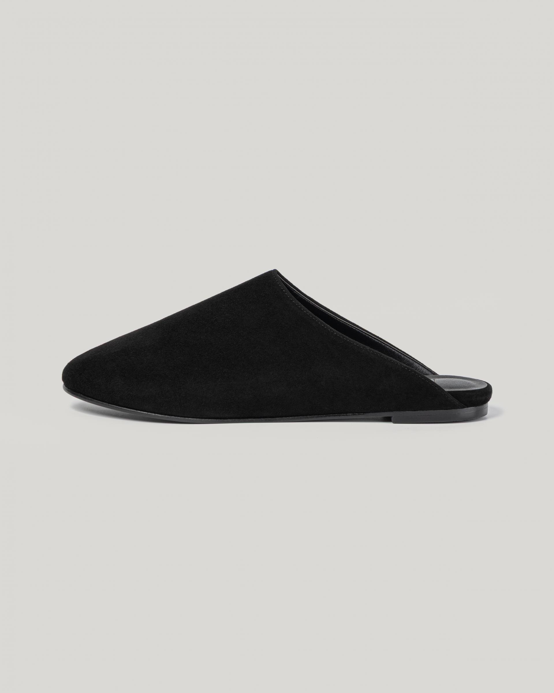 A classic suede mule with bold outlines and a refined, luxurious mood.