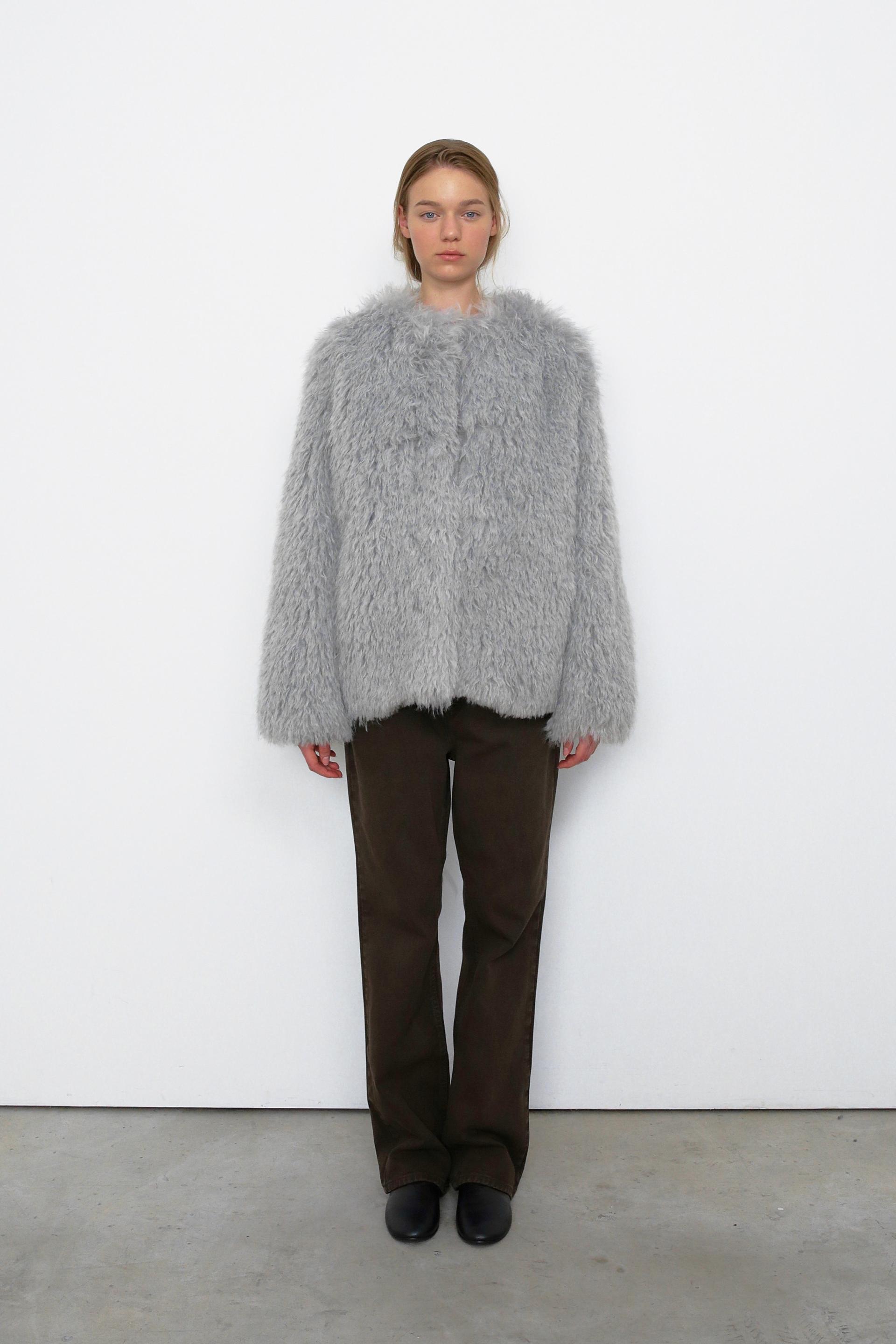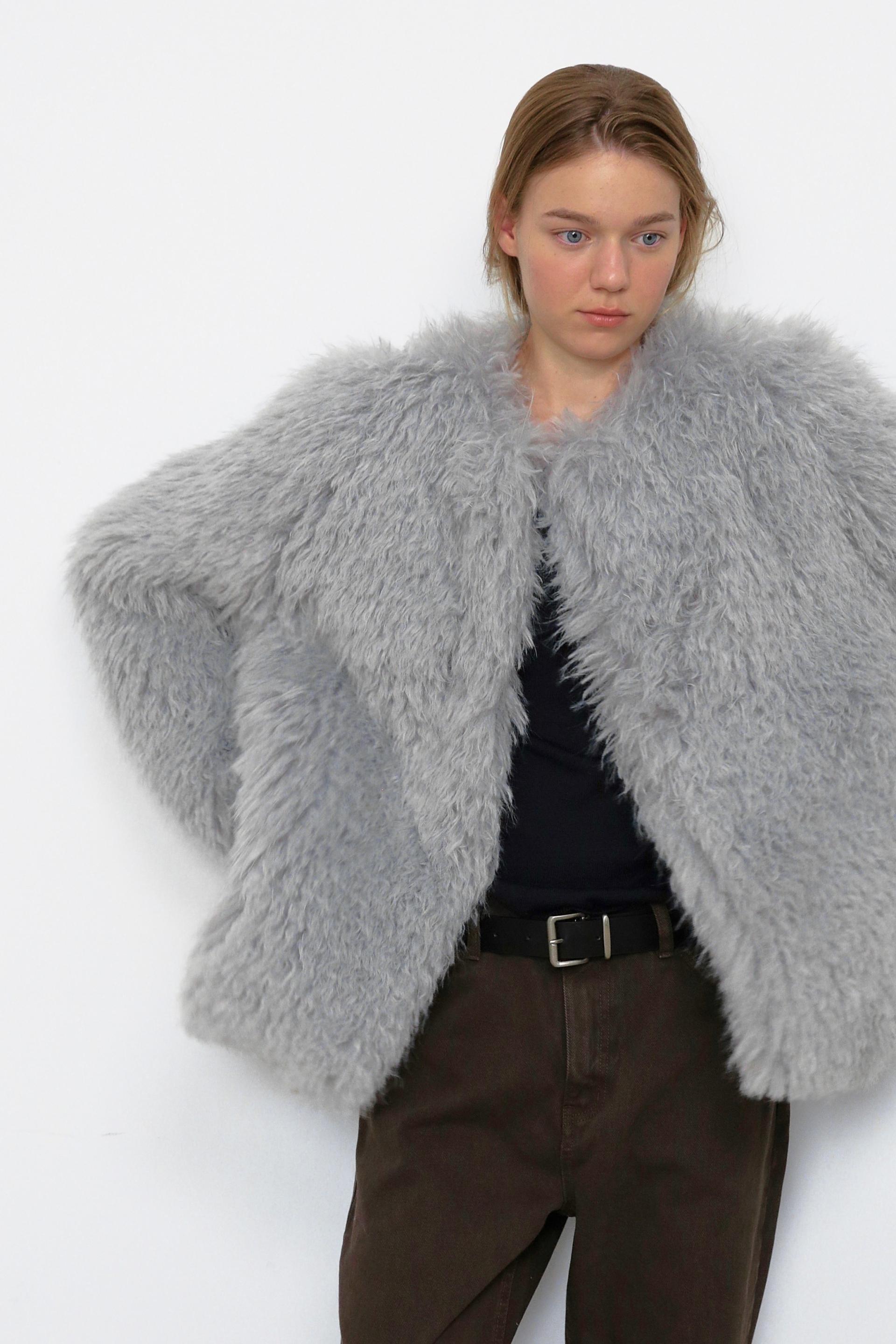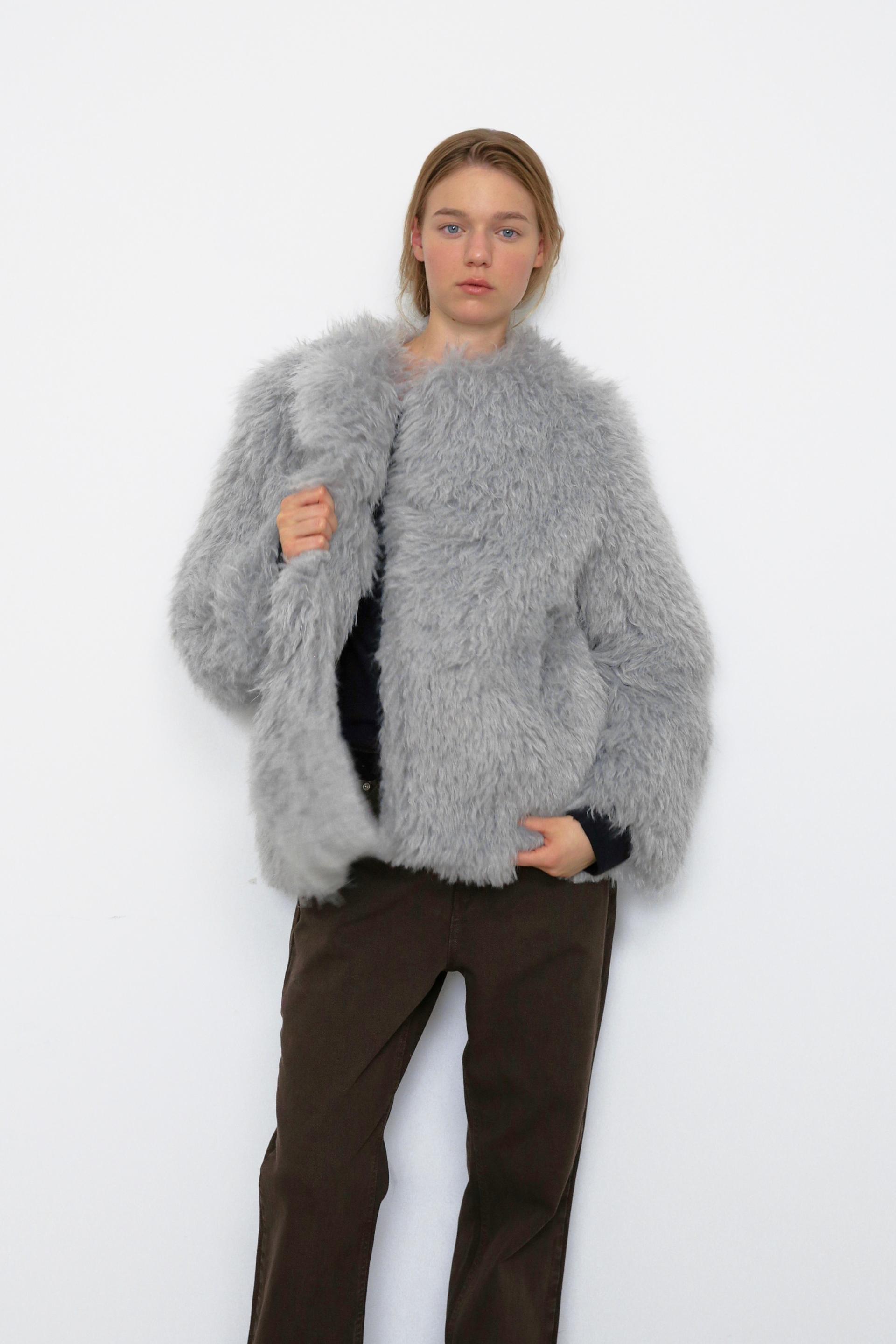 This faux fur half coat features a subtle, sophisticated ash grey color that adds a unique charm to any outfit.