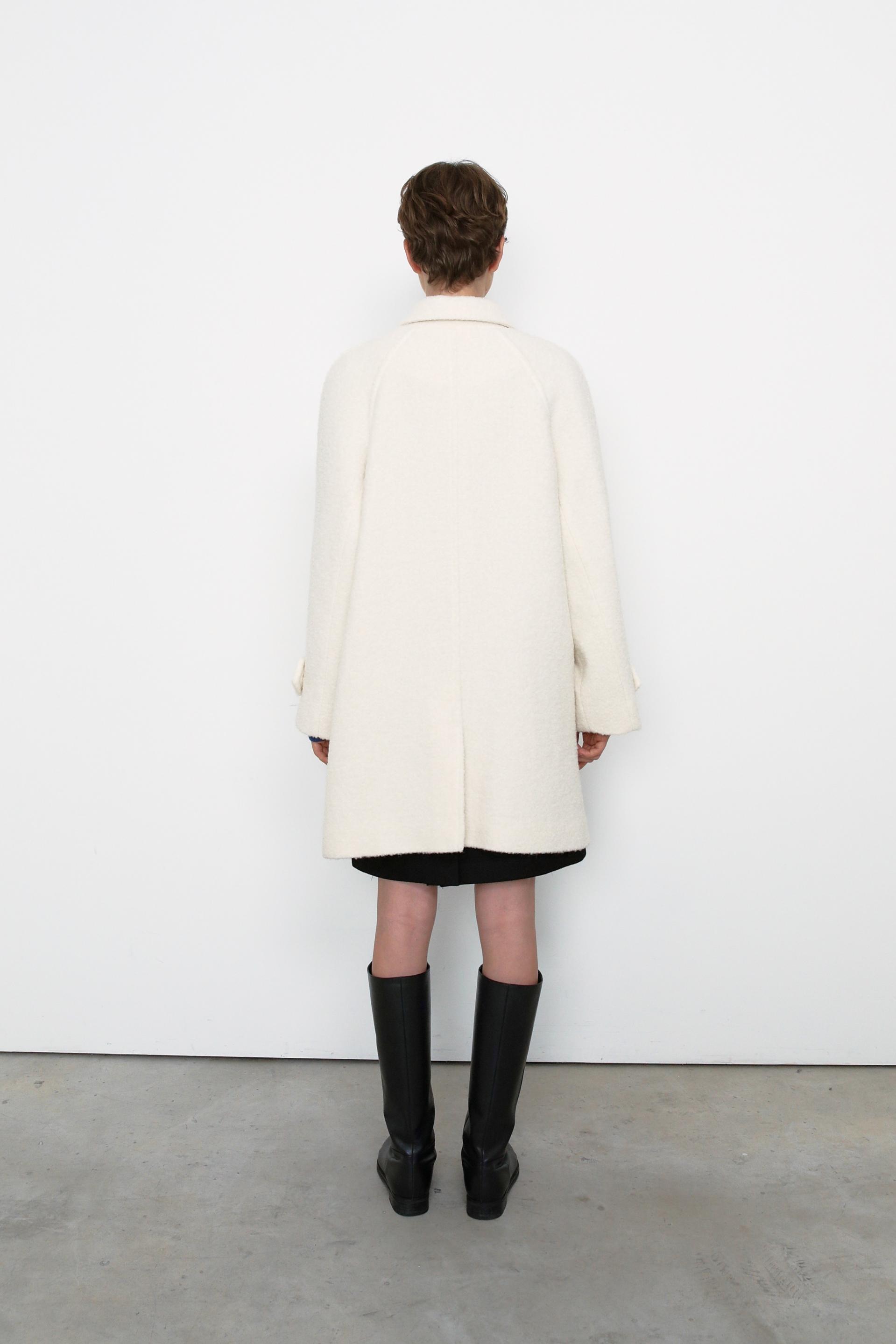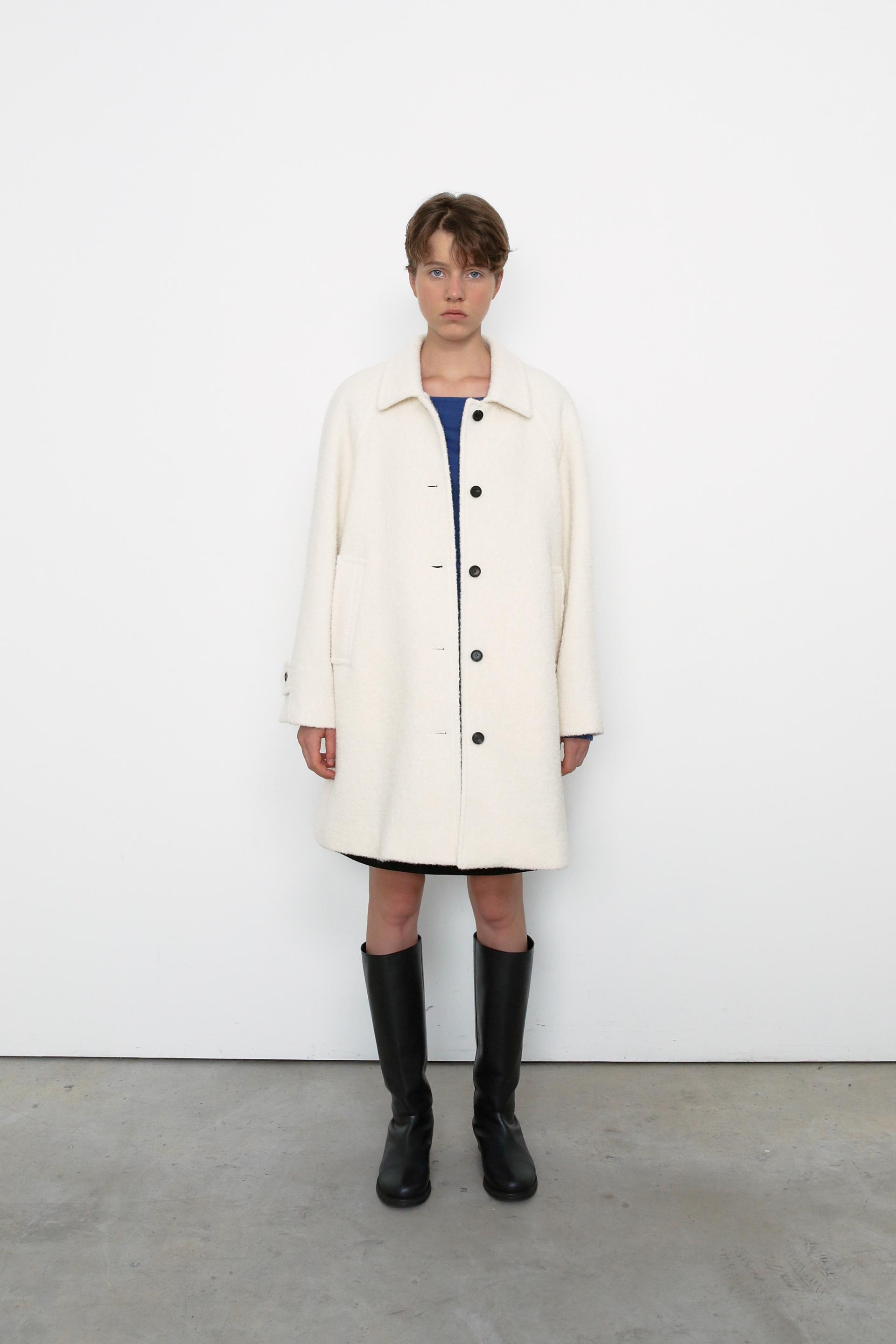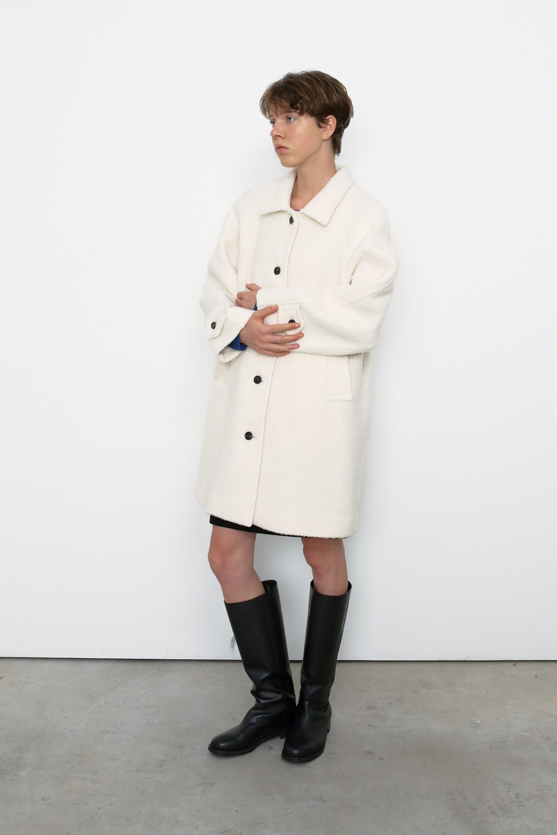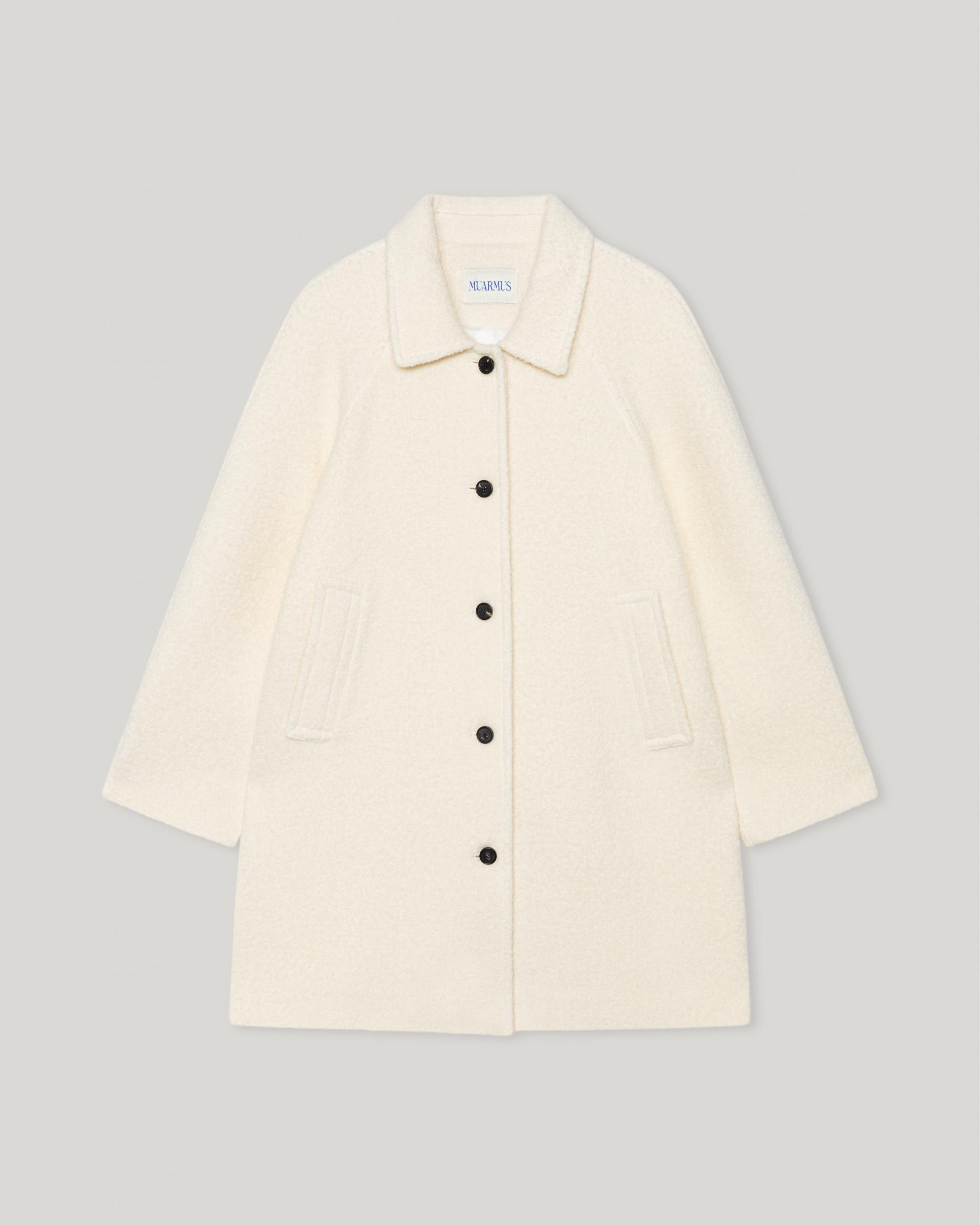 This half coat is crafted from a richly textured bouclé fabric — a perfect winter material with both warmth and character.