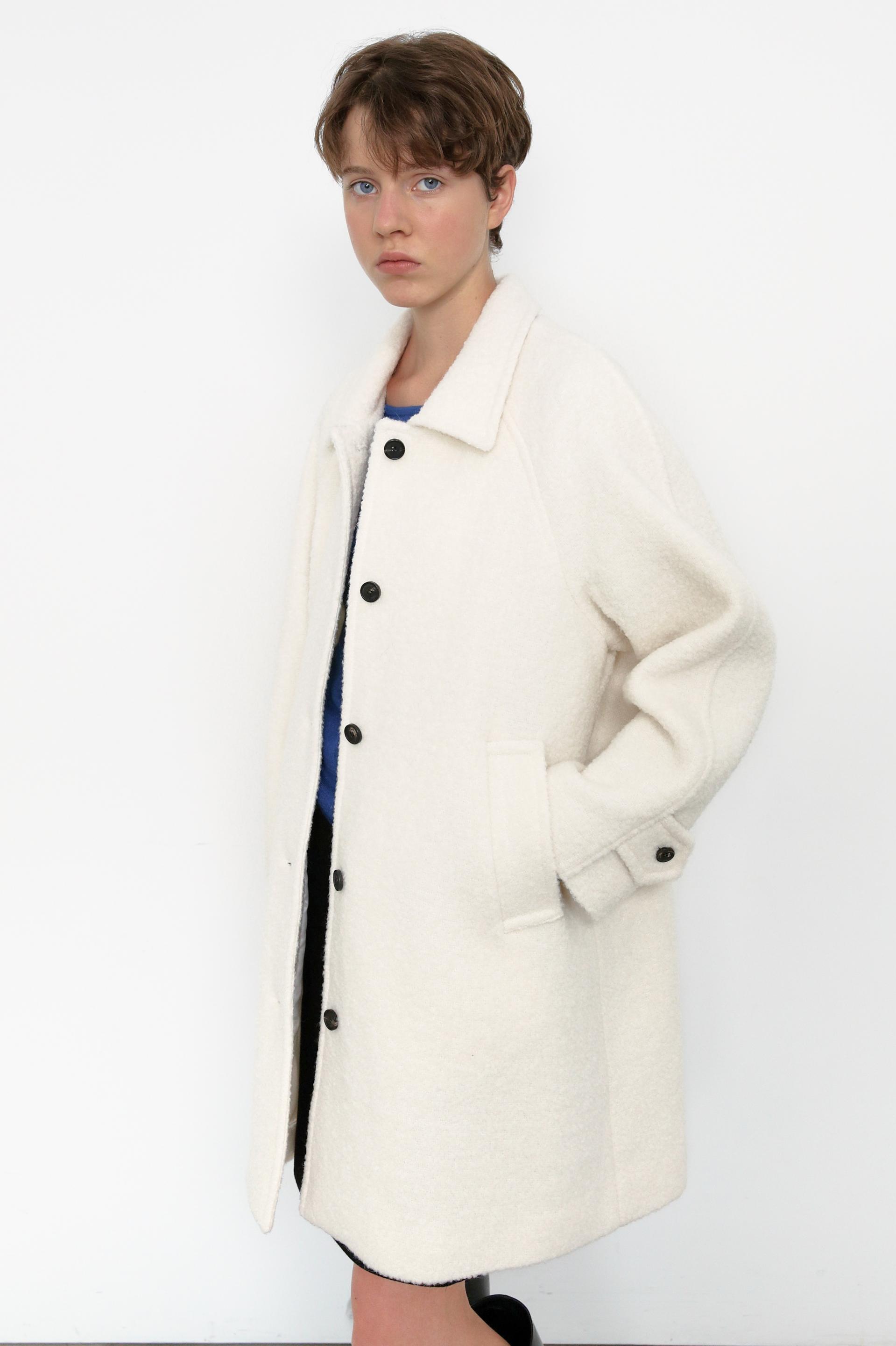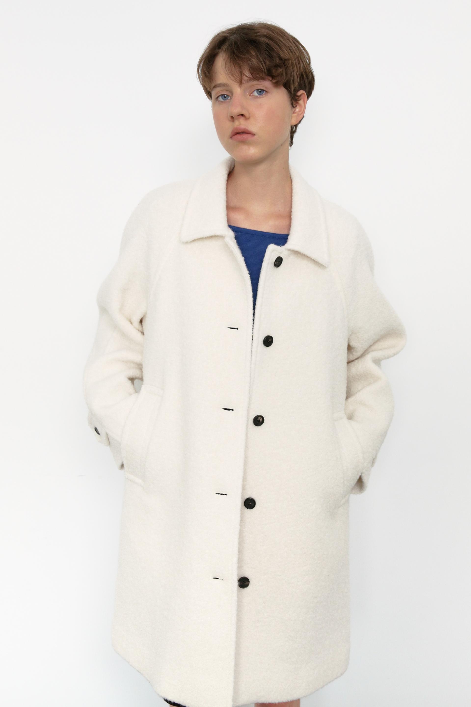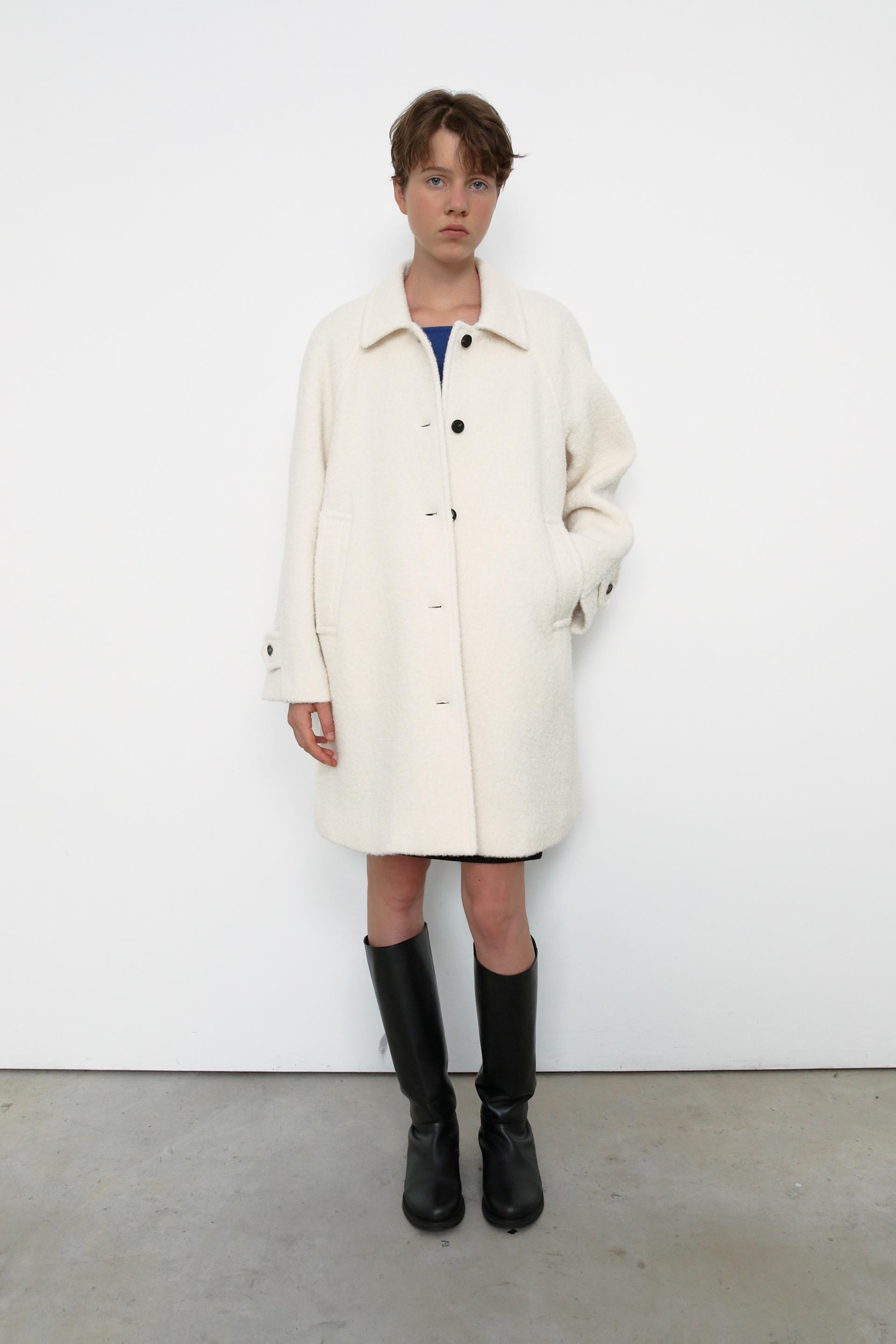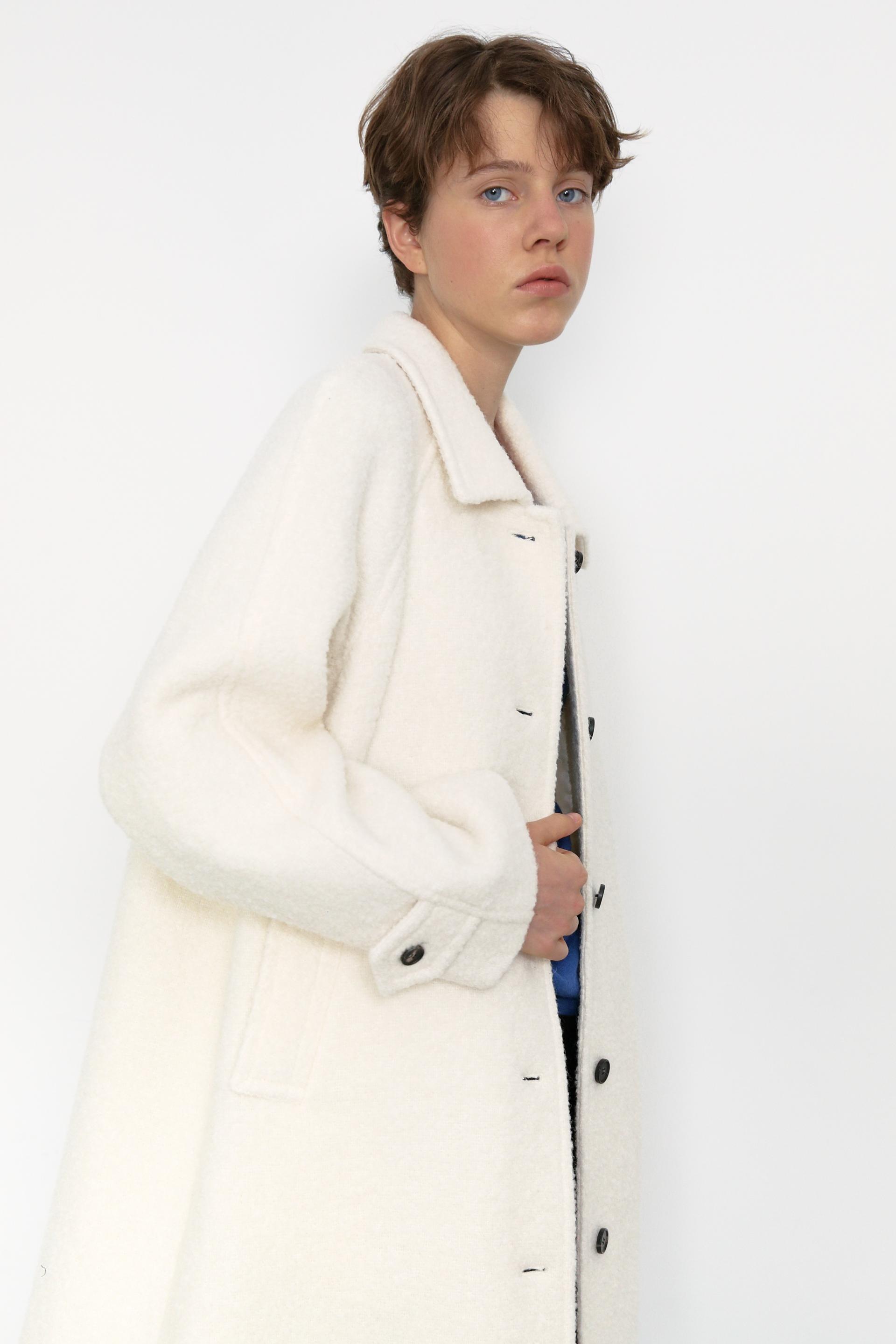 This half coat is crafted from a richly textured bouclé fabric — a perfect winter material with both warmth and character.