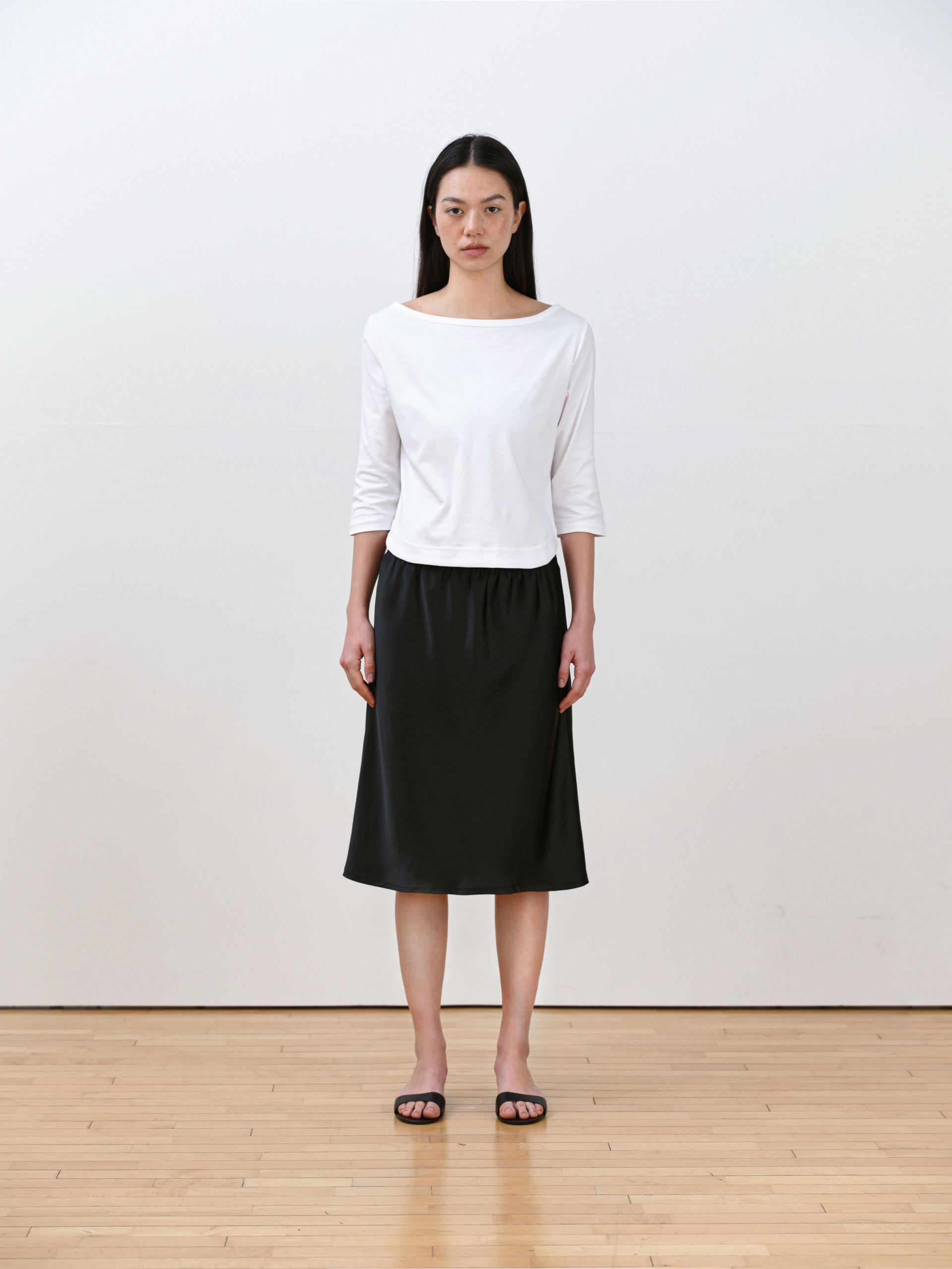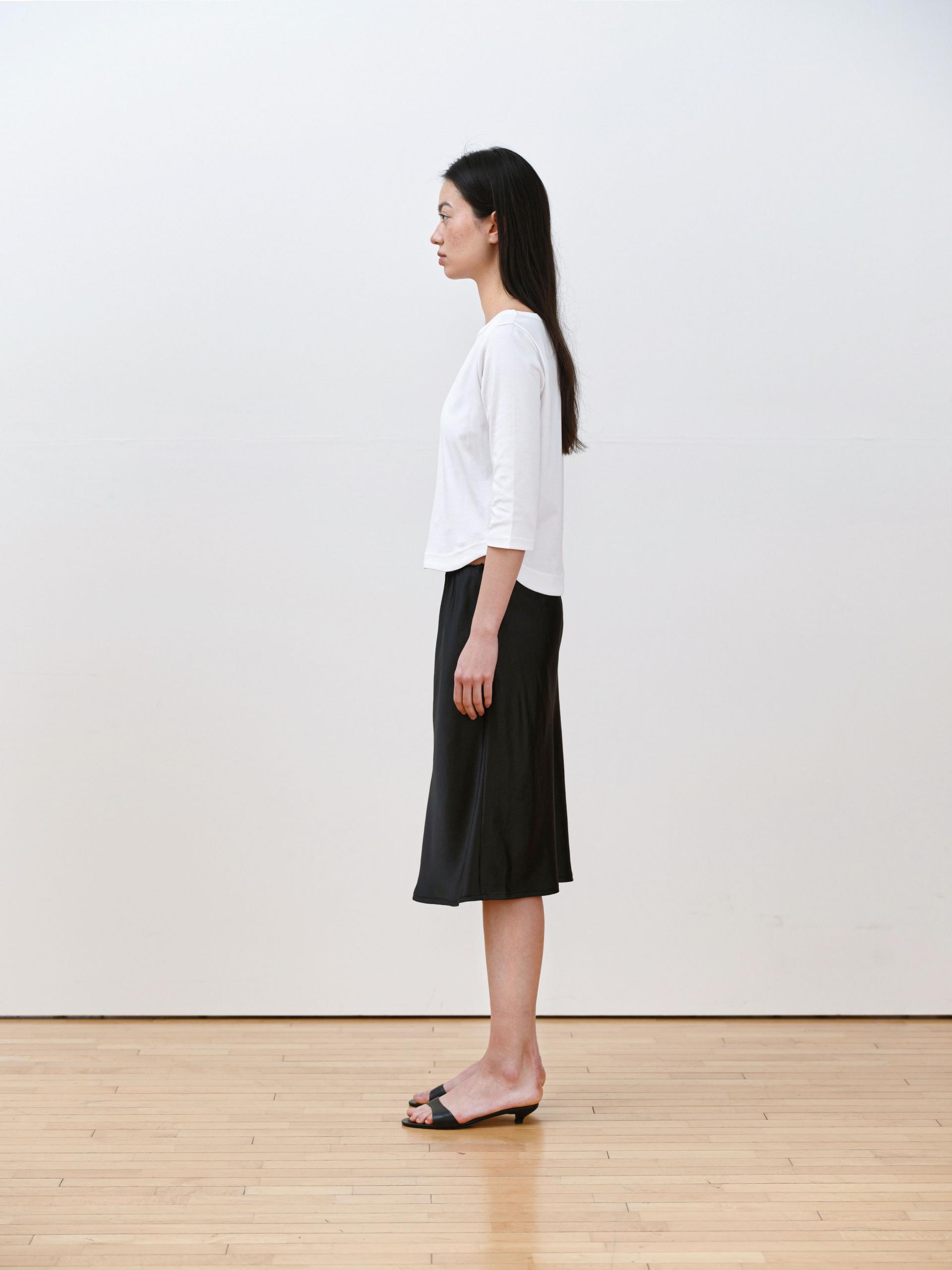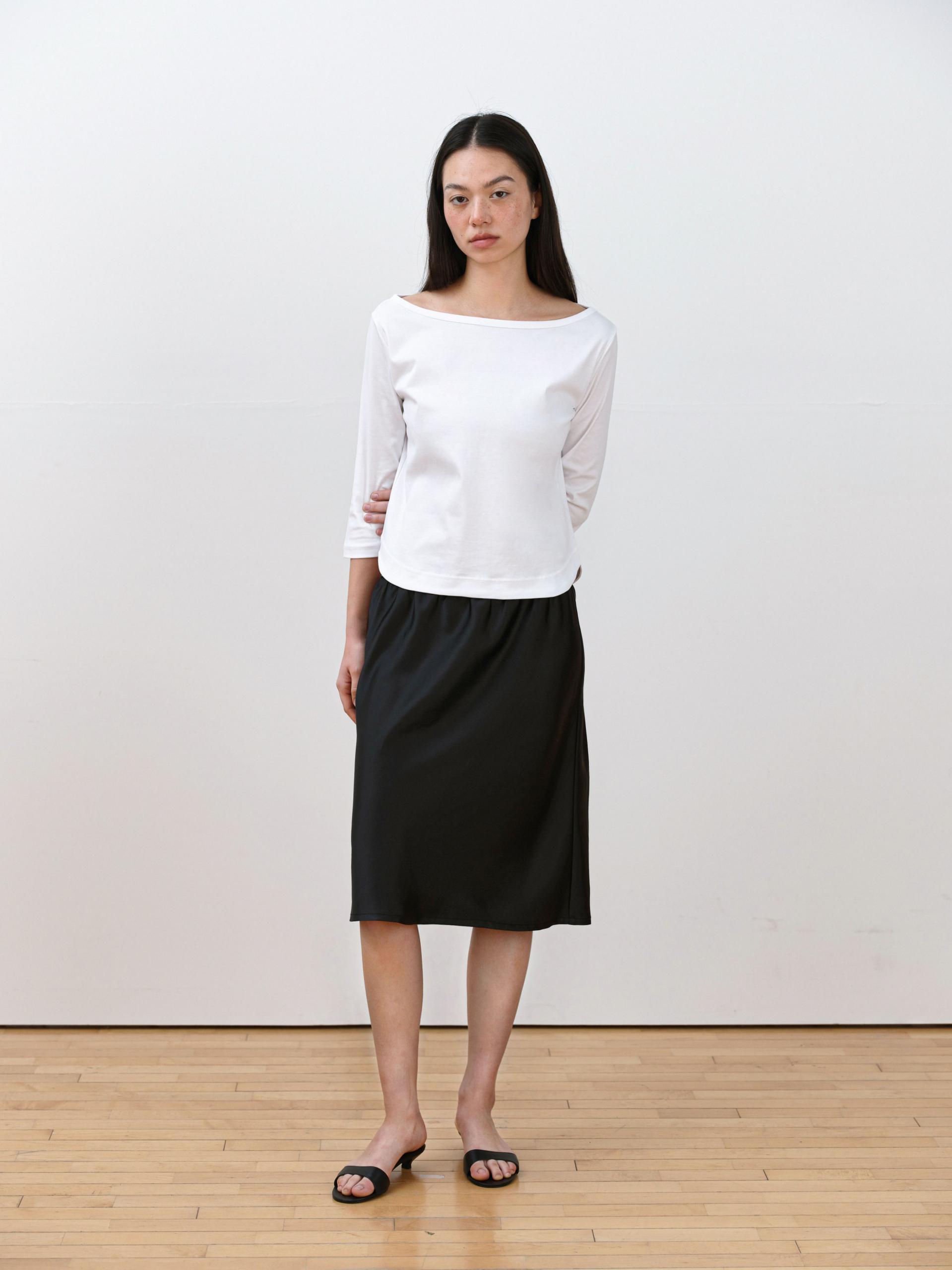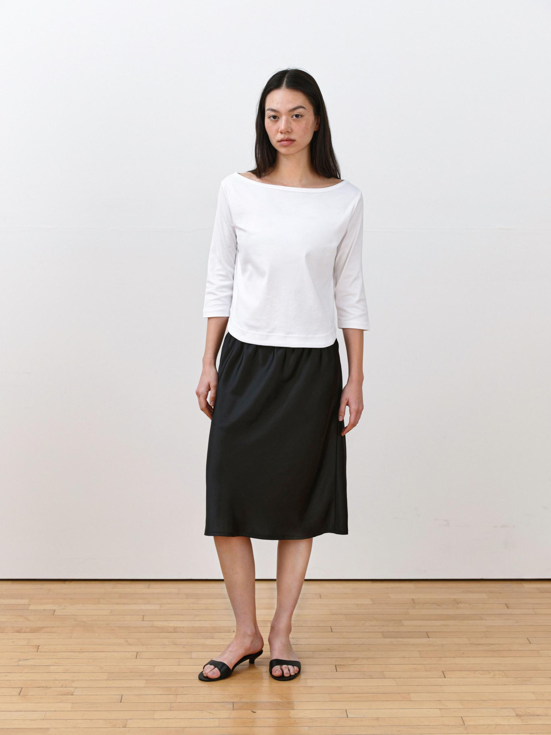 This 3/4 sleeve T-shirt features a softly flowing boat neckline that creates a feminine silhouette. Made from a lightweight and flexible fabric with a smooth touch, it feels gentle against the skin and offers comfortable wear. Perfect on its own or layered under outerwear, it’s an easy daily essential you’ll reach for often. The clean, moderate neckline provides a relaxed fit without feeling restrictive.