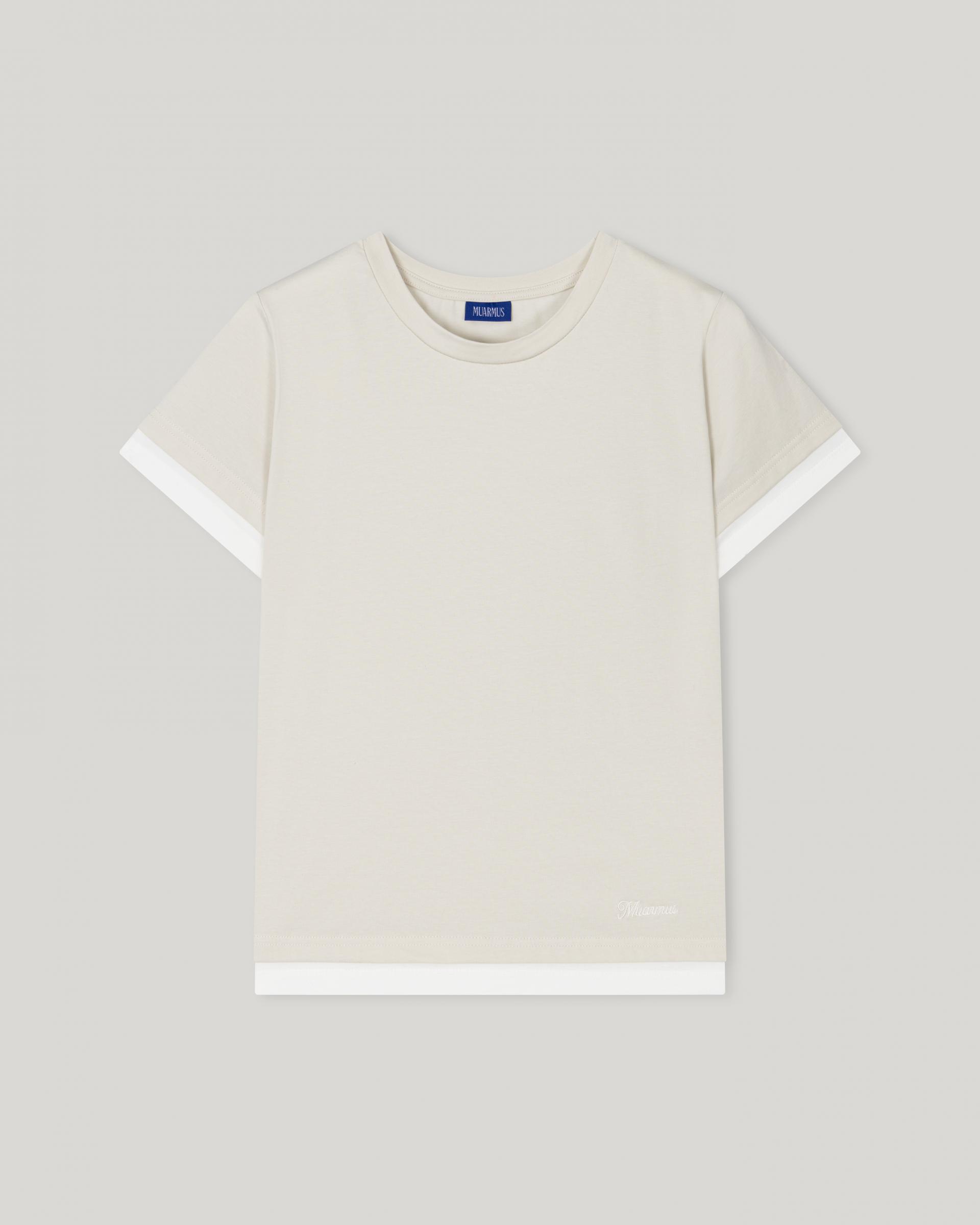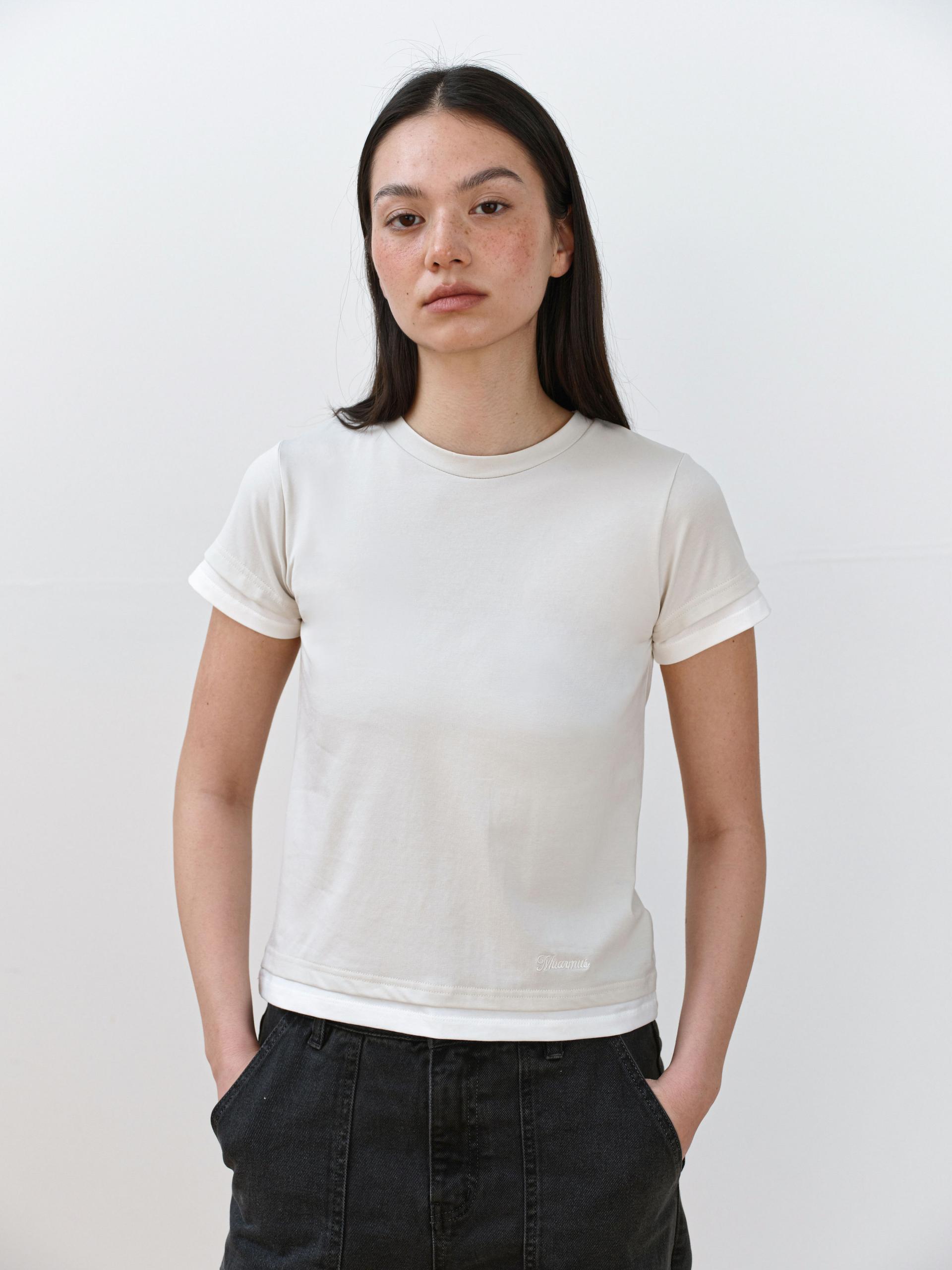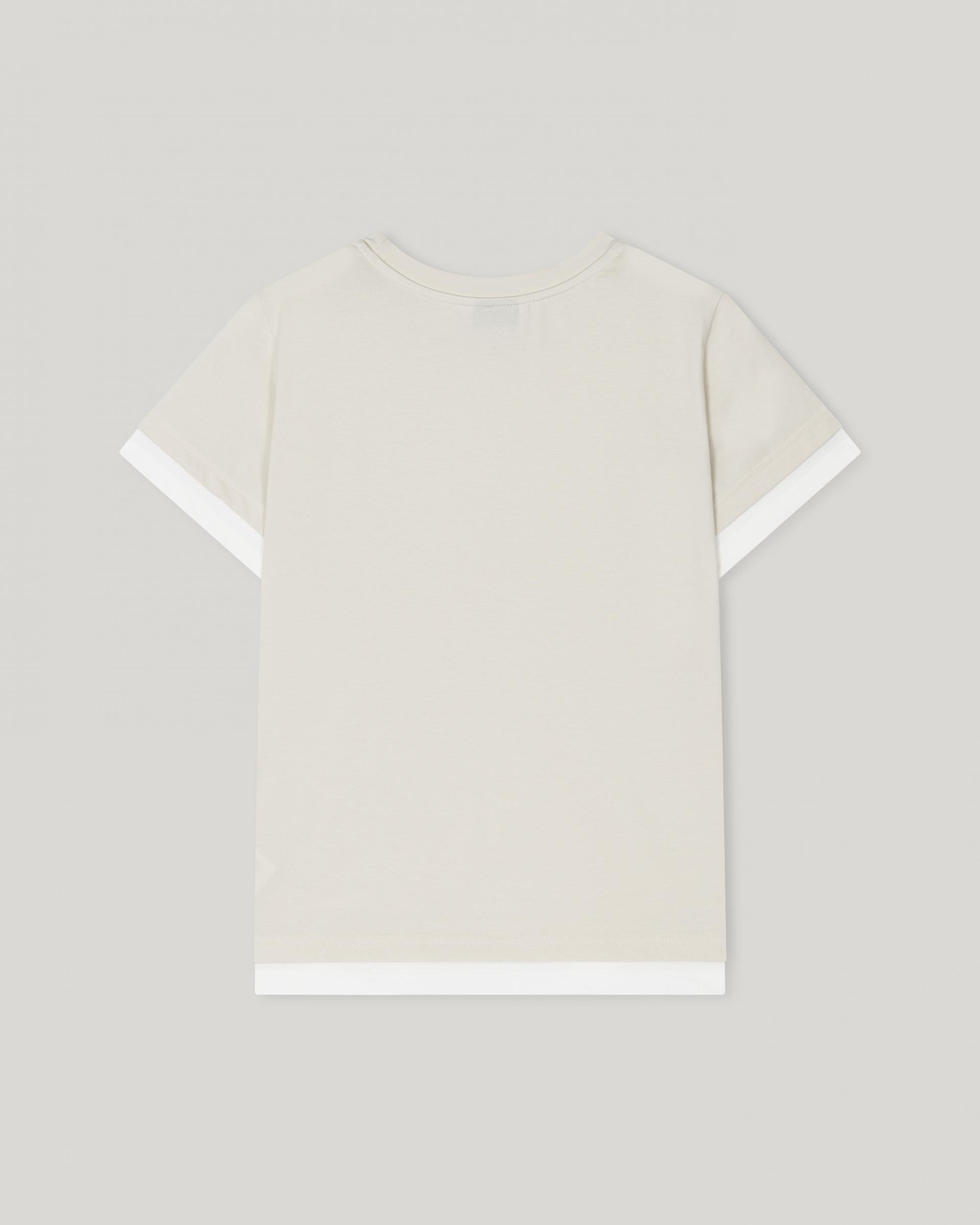 A T-shirt designed with a layered-look pattern that creates a modern casual mood.