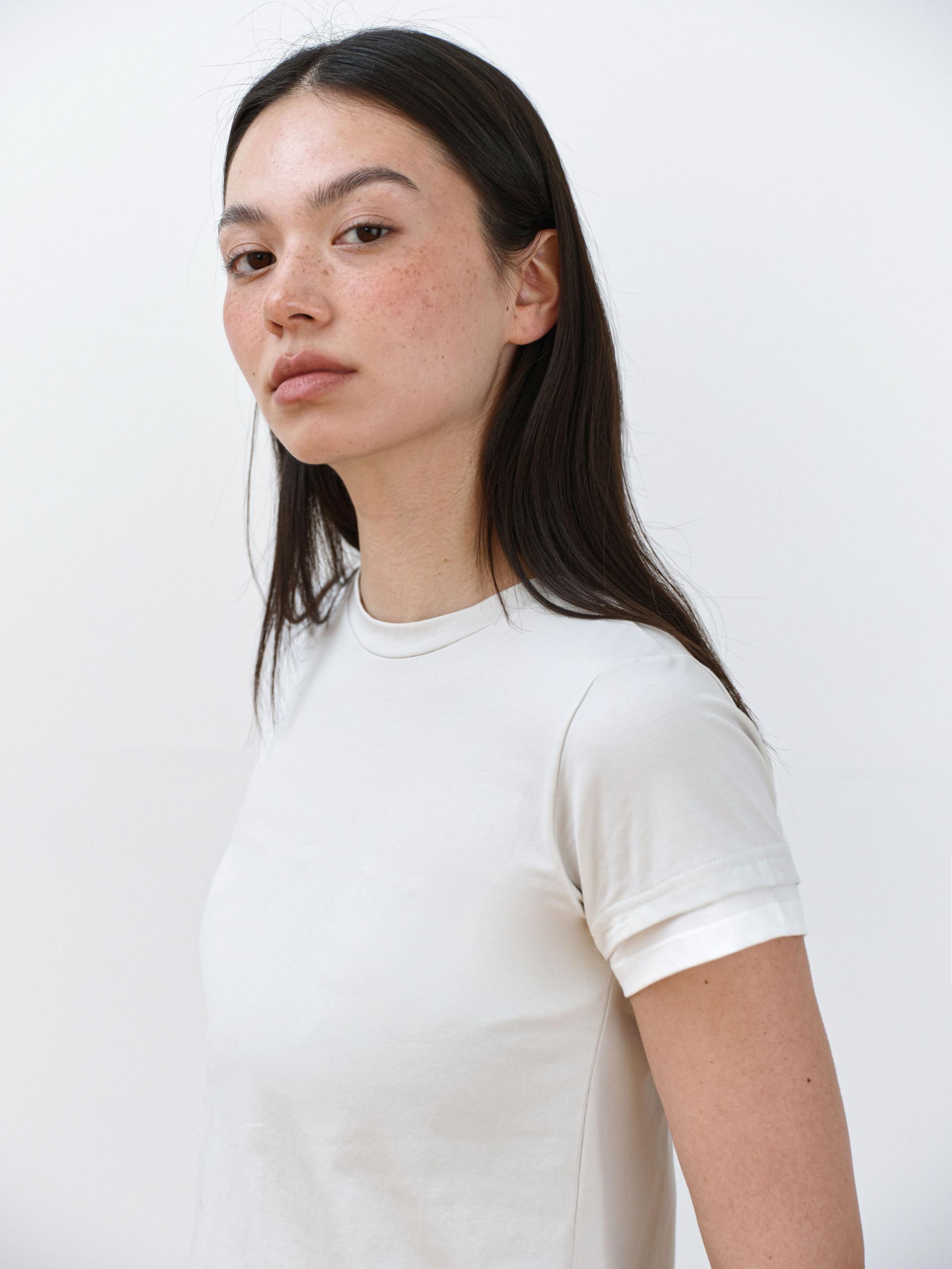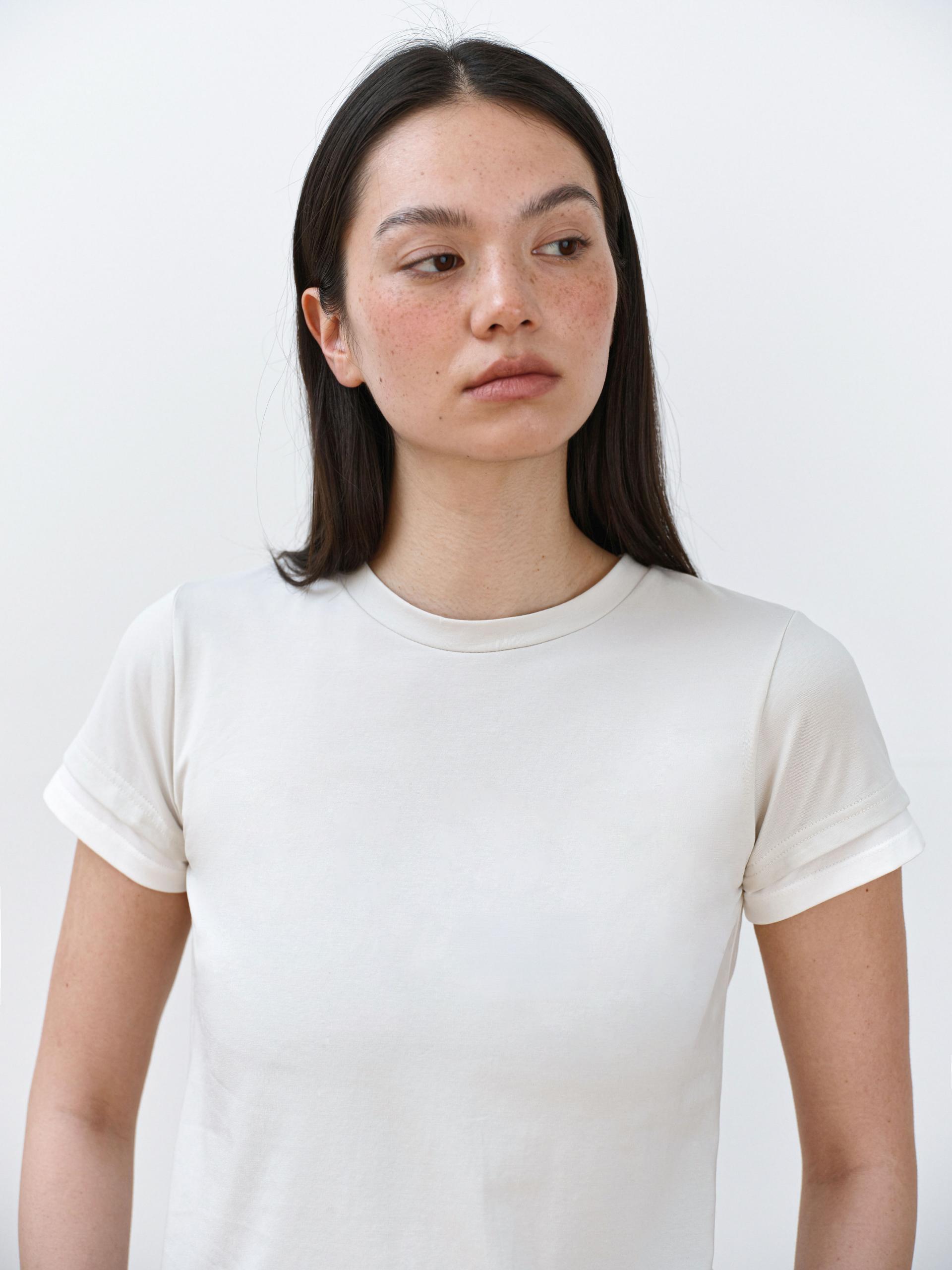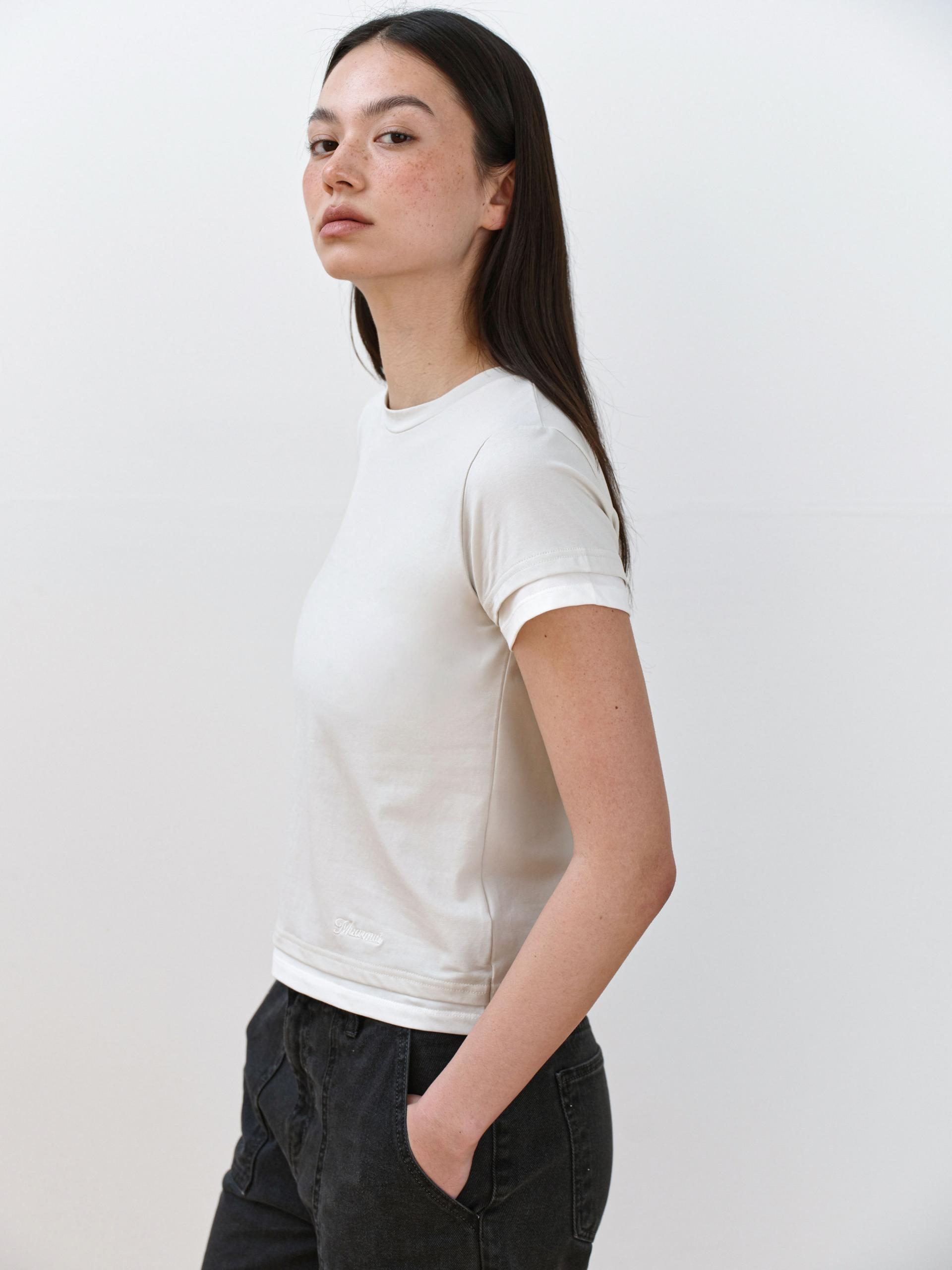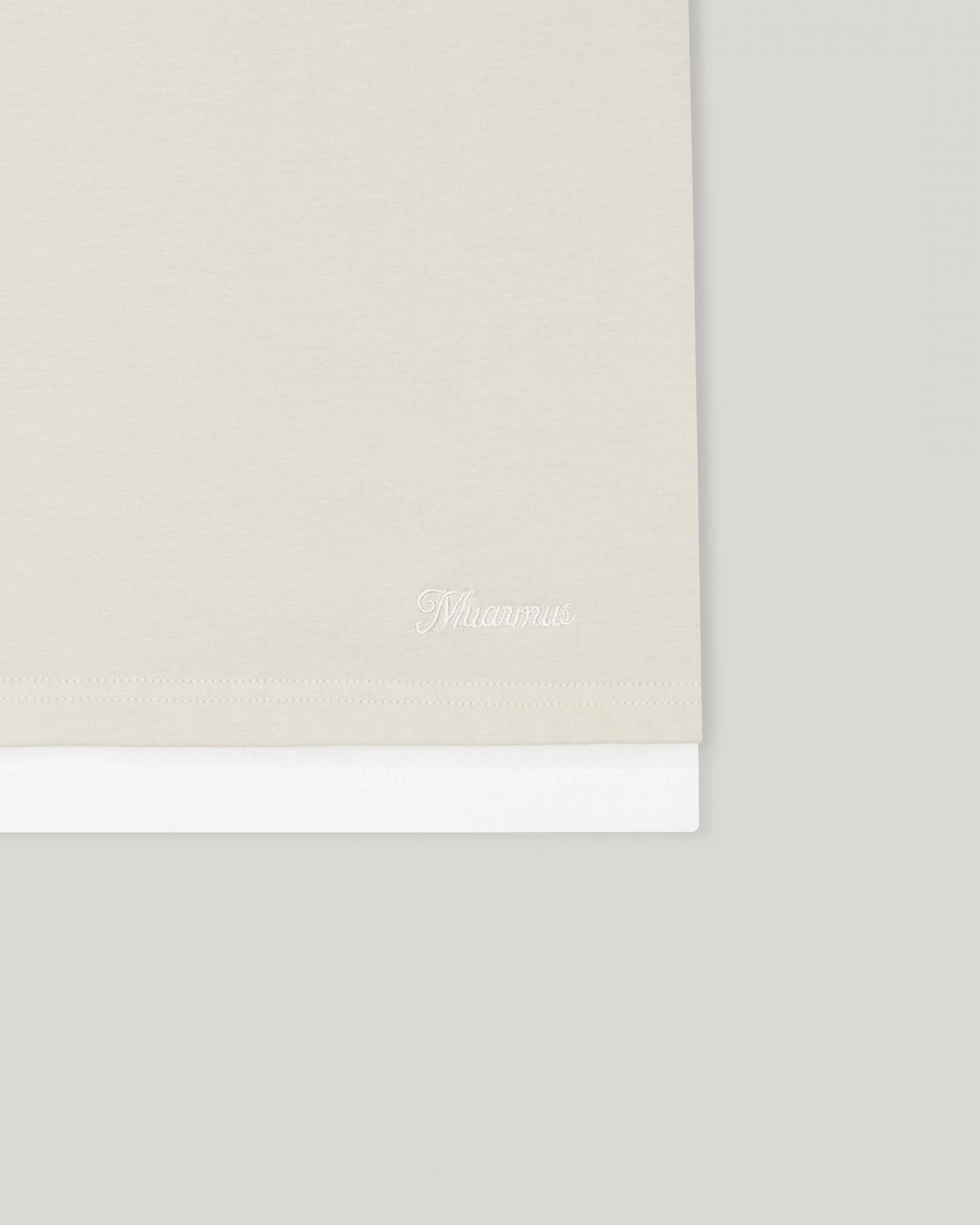 A T-shirt designed with a layered-look pattern that creates a modern casual mood.