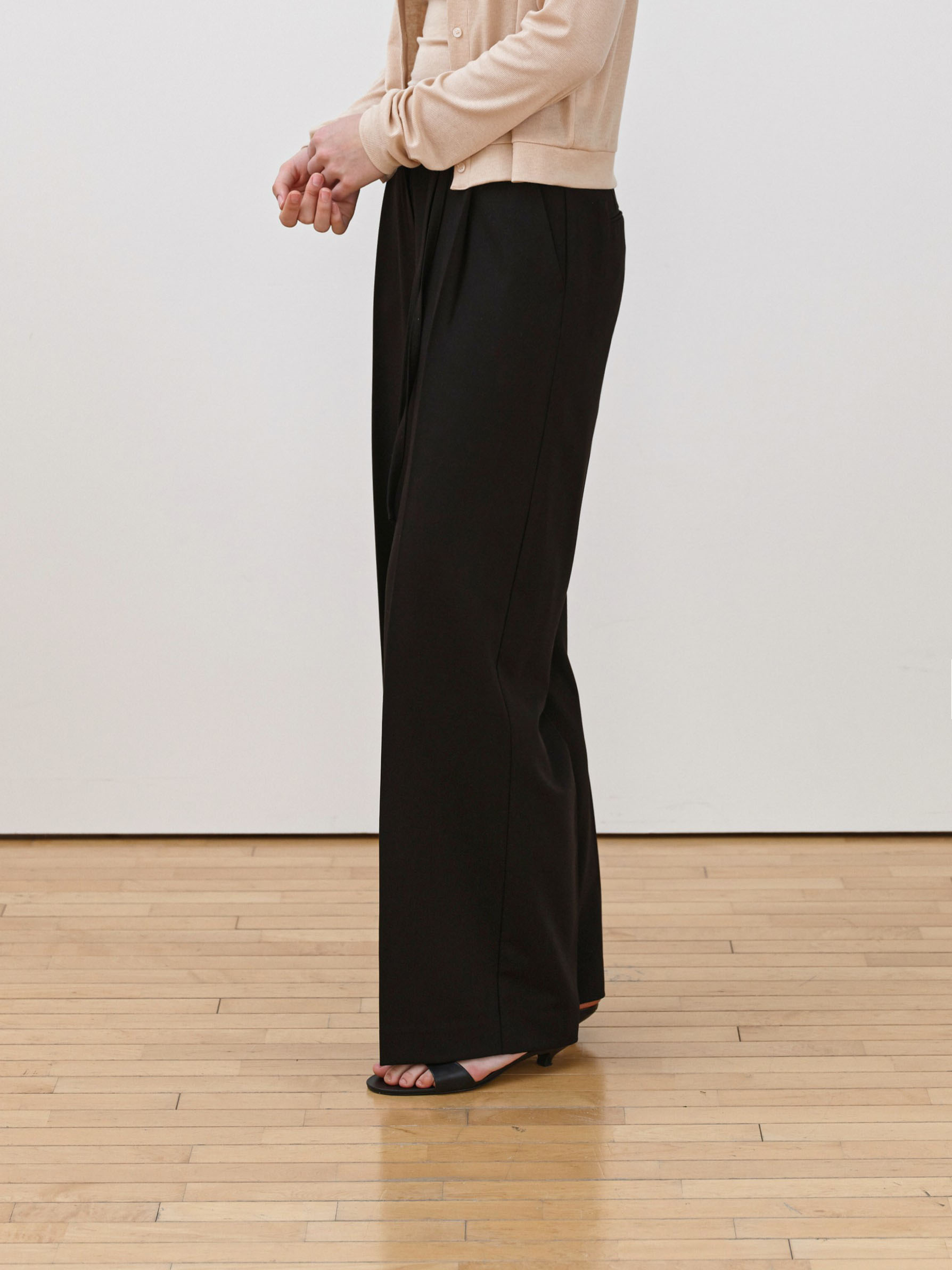These slacks feature a classic wide silhouette, crafted from a firm yet flexible fabric that offers a comfortable feel. The naturally flowing line elongates the legs for a slimmer look, while the clean, minimal design makes them easy to pair with a variety of tops.