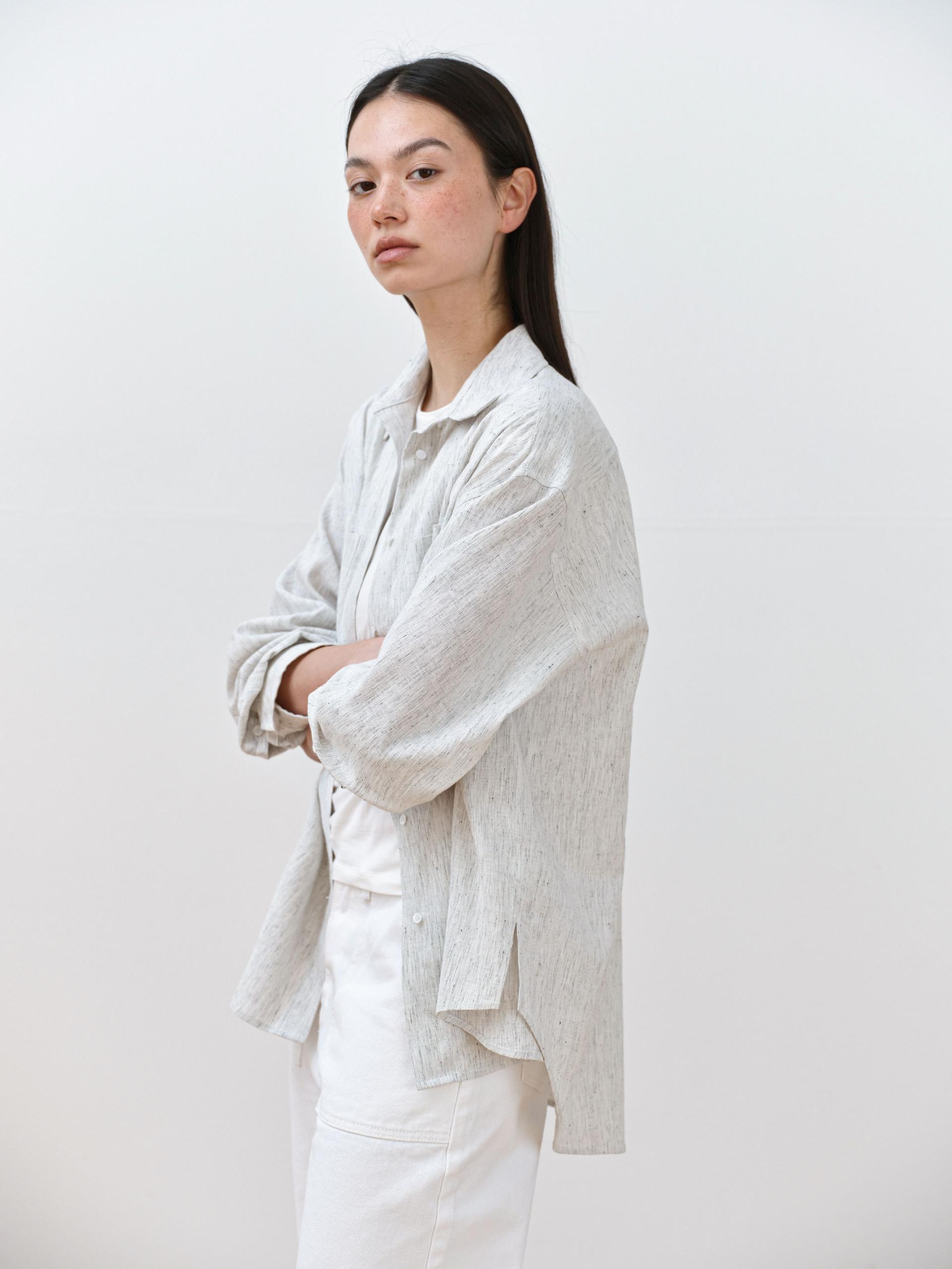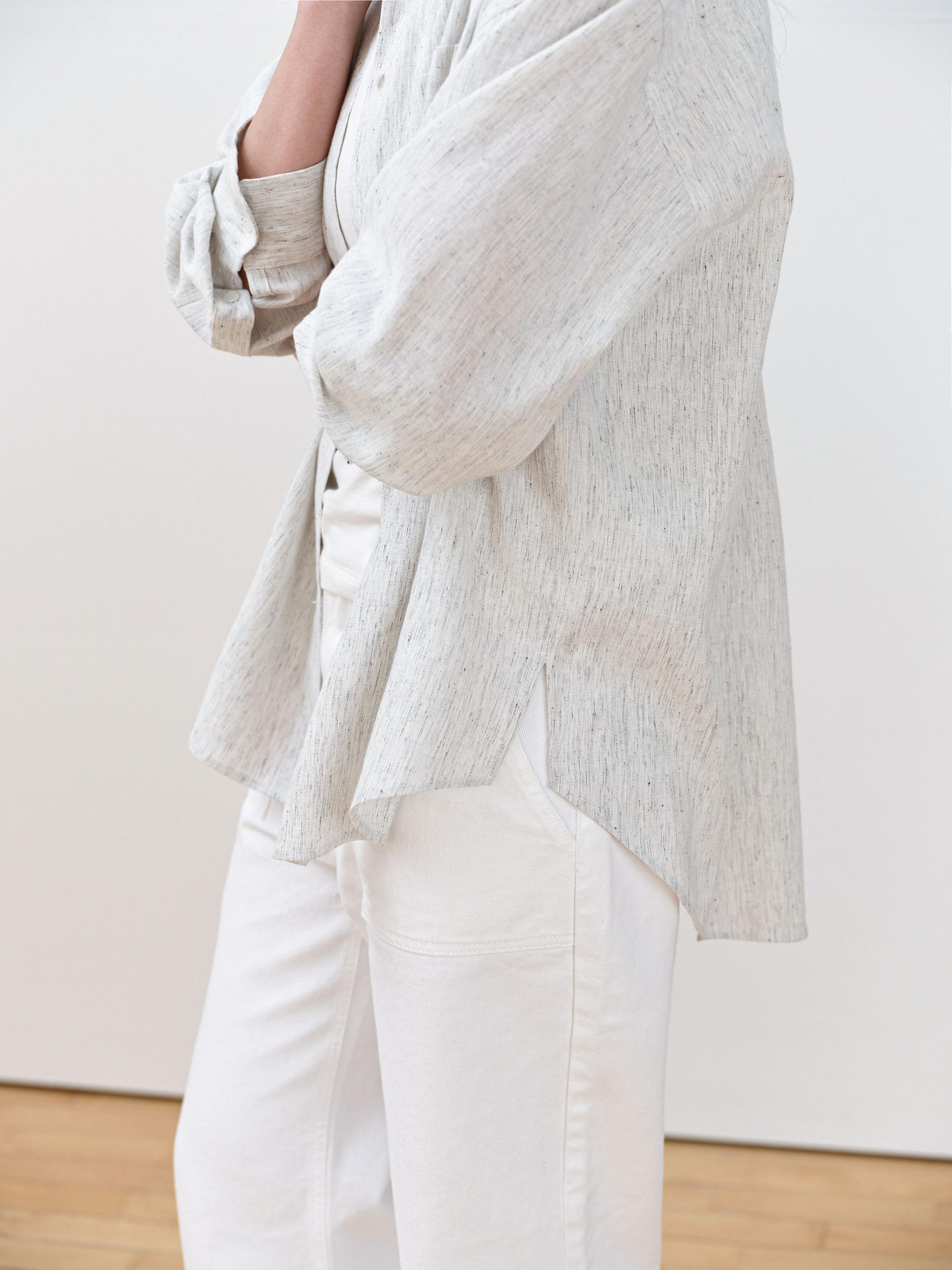 it can be worn on its own or layered like a lightweight outerwear piece during transitional seasons.