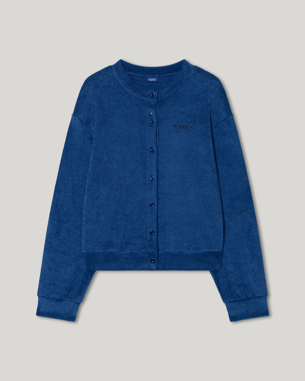 Tone-on-tone buttons engraved with the MUARMUS logo add a refined detail,