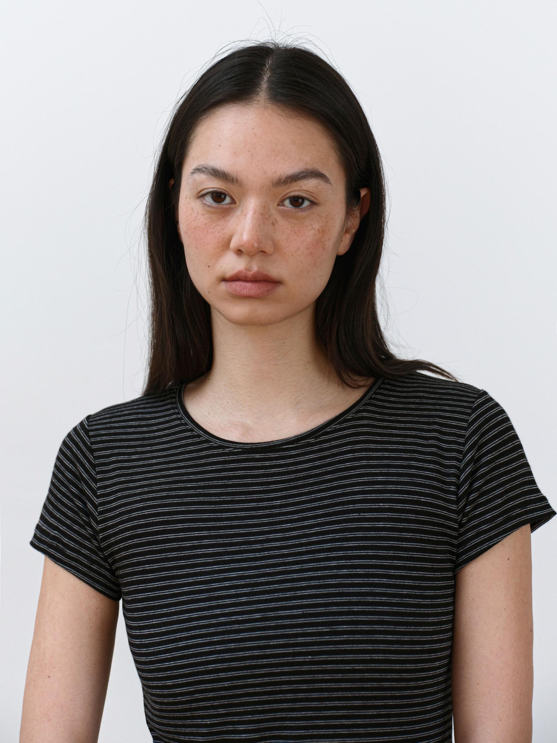 A slim-fit striped T-shirt crafted from a softly flowing rayon-blend fabric.