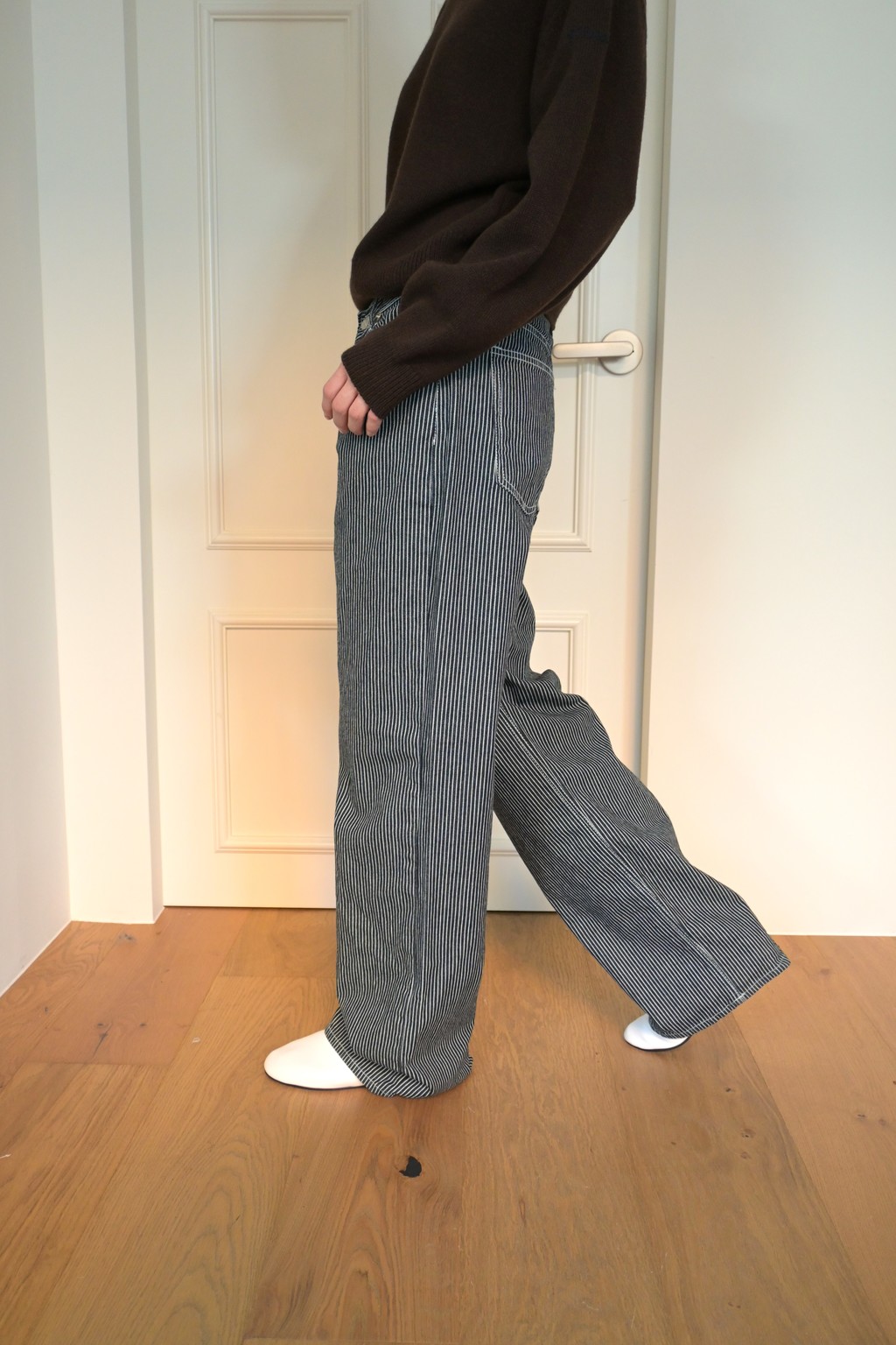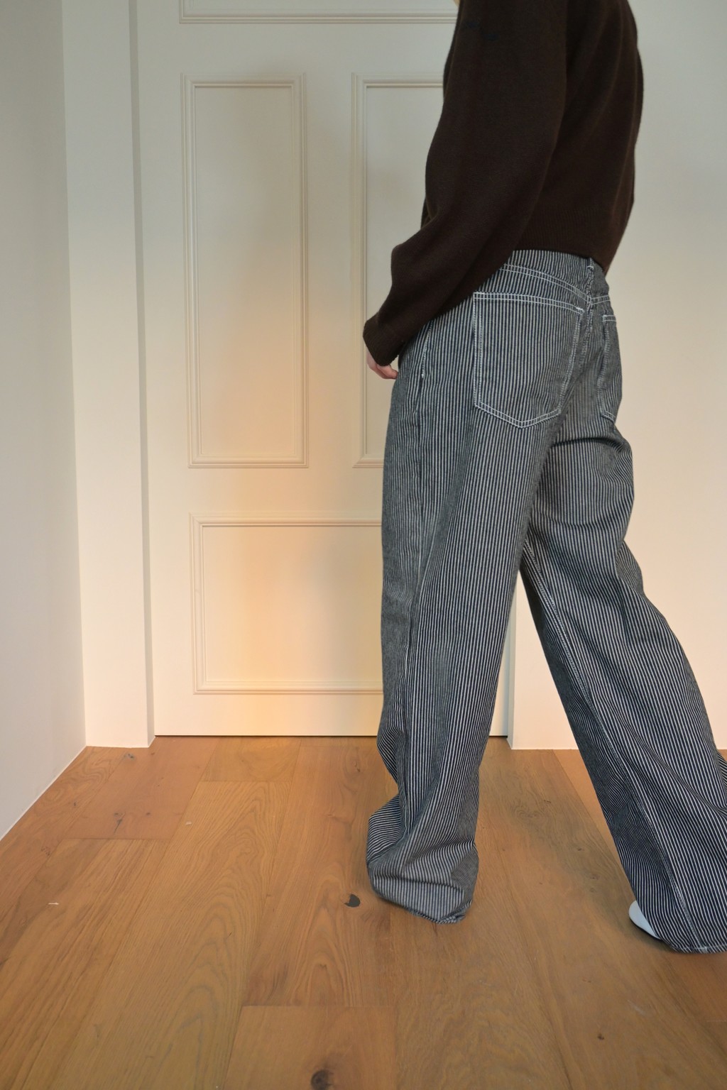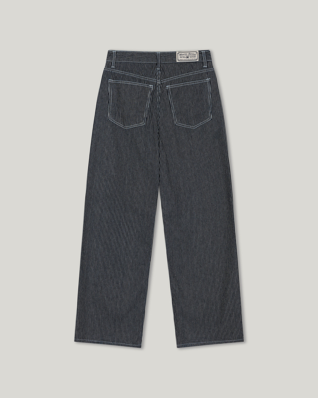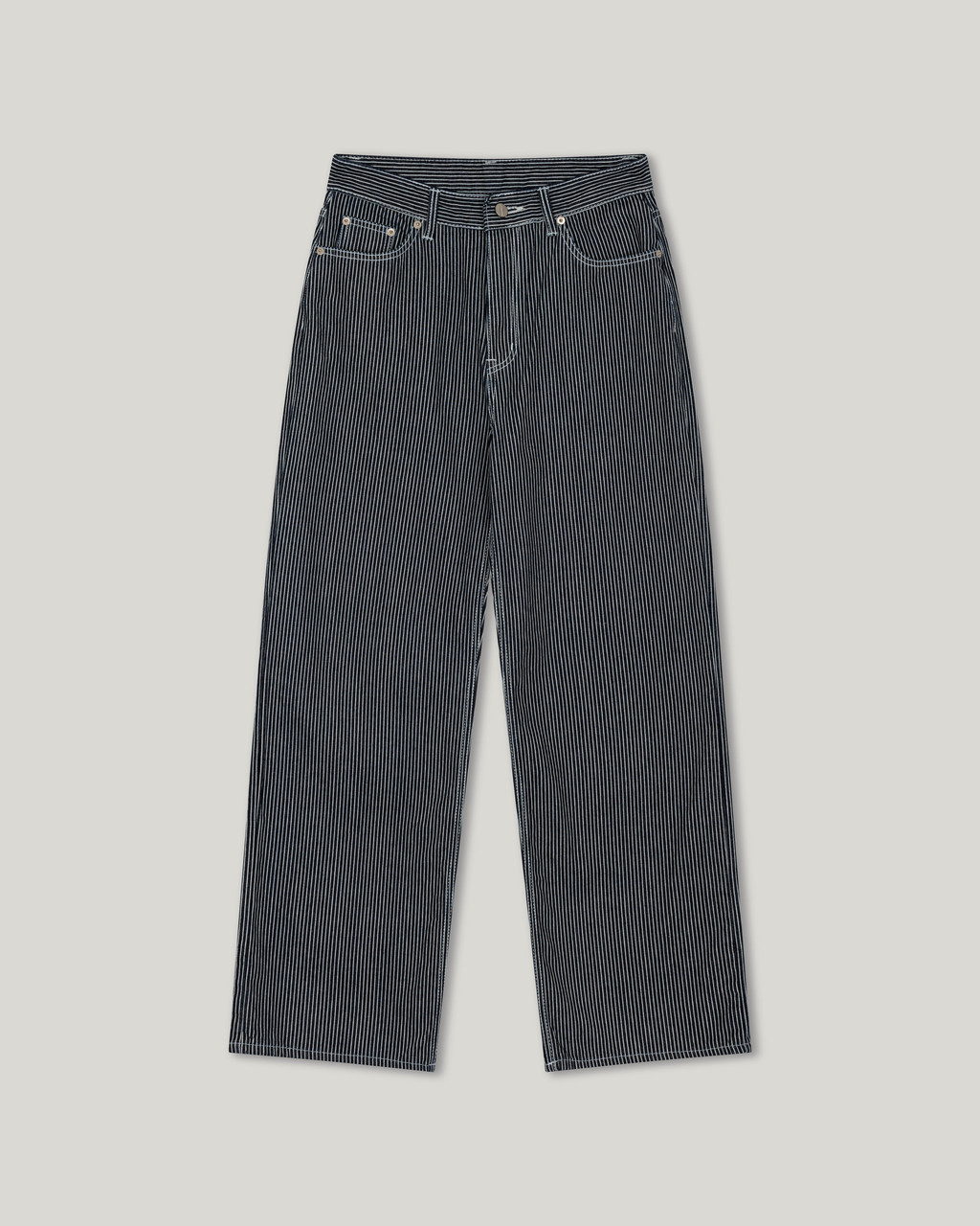 These wide-leg denim pants feature a bold stripe pattern that stands out. Made from comfortable, easy-to-wear fabric, they offer great freedom of movement. The stripe design creates a lengthening and slimming effect, making these pants a statement piece for any outfit.
