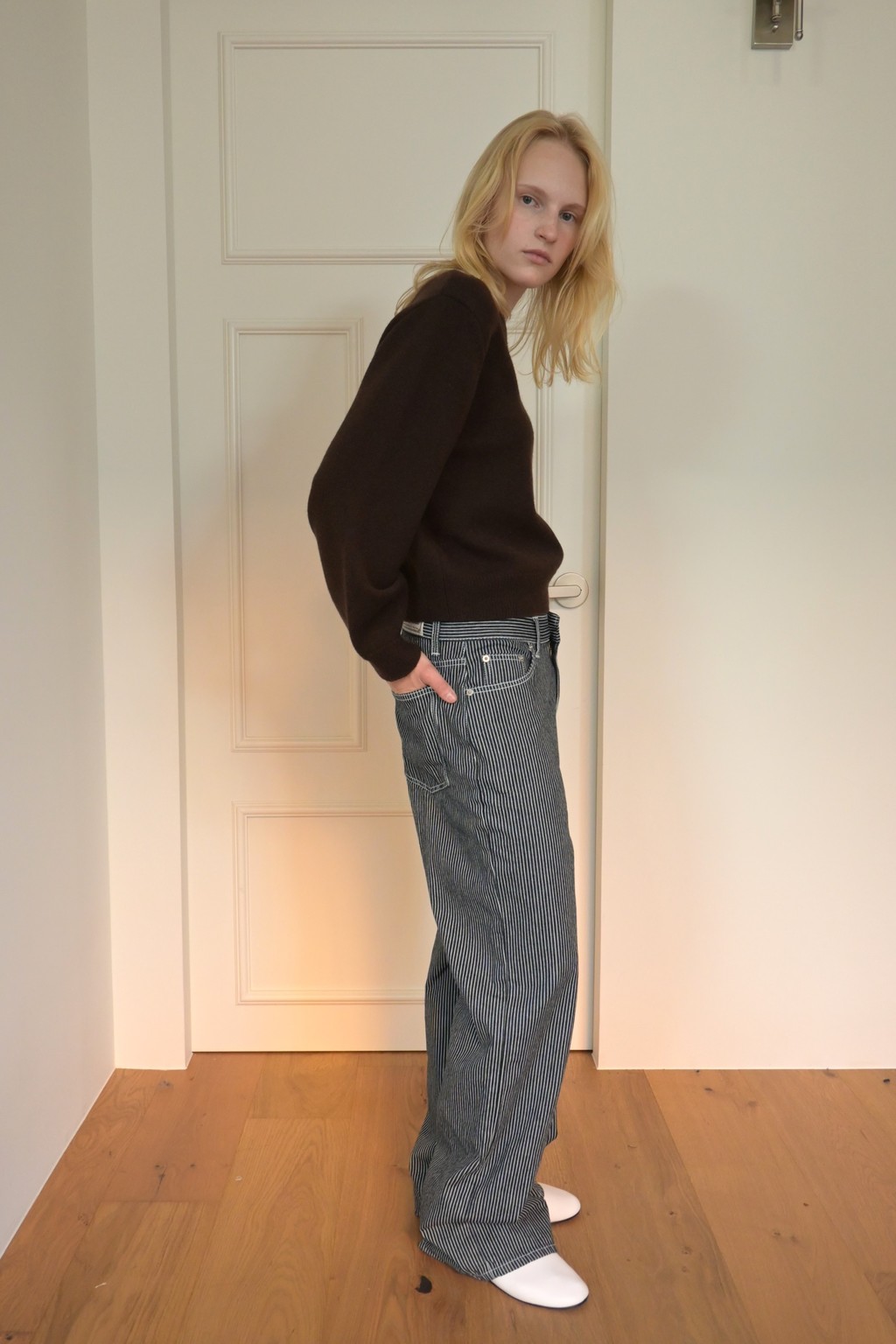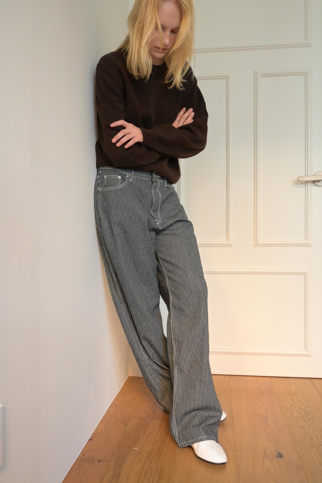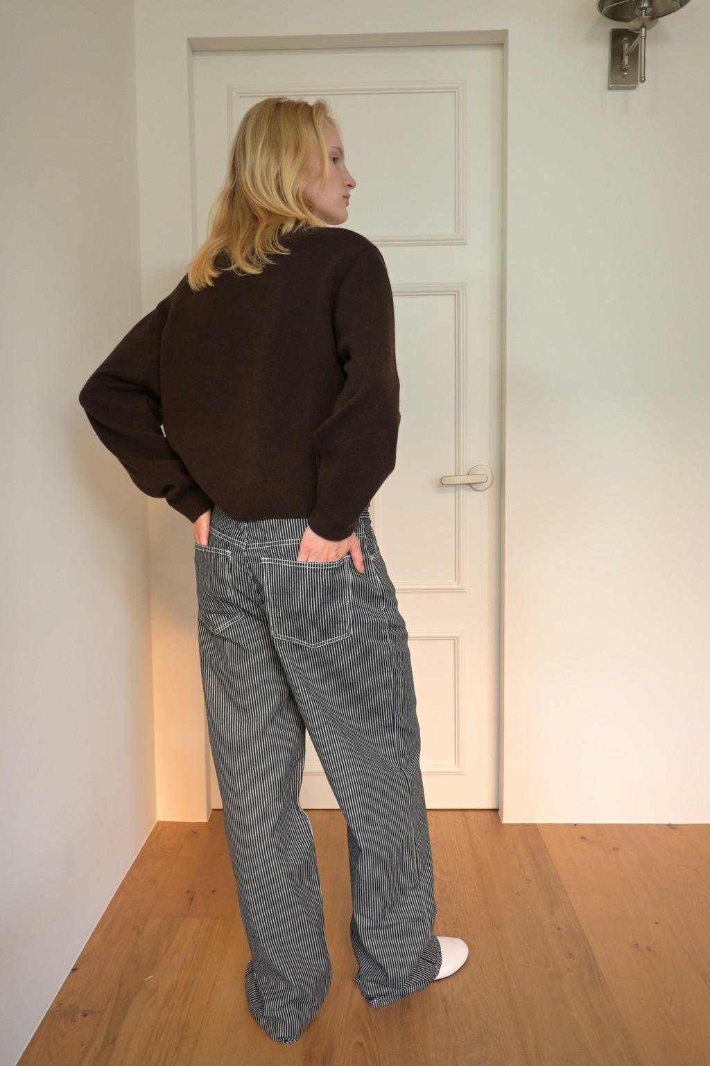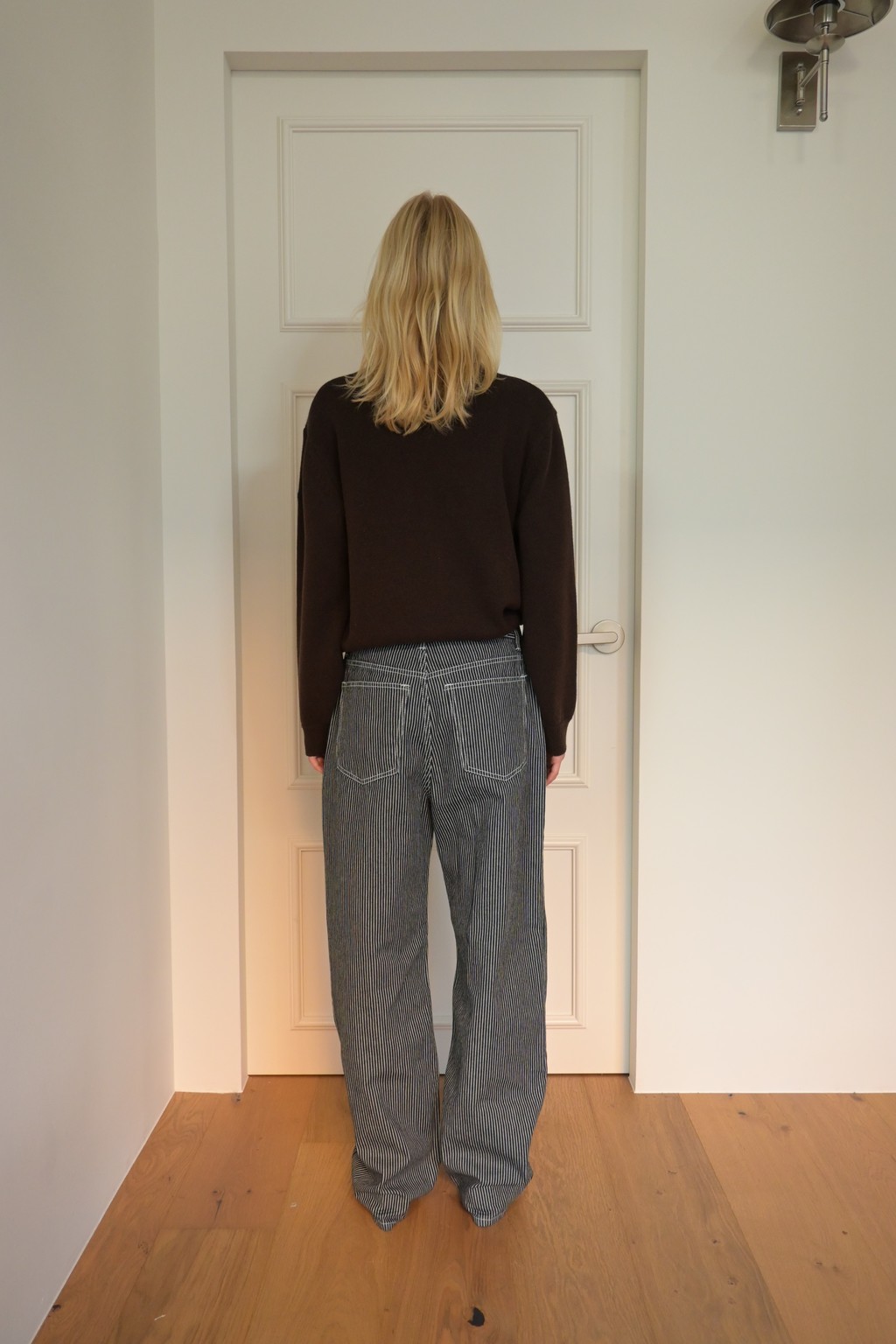 These wide-leg denim pants feature a bold stripe pattern that stands out. Made from comfortable, easy-to-wear fabric, they offer great freedom of movement. The stripe design creates a lengthening and slimming effect, making these pants a statement piece for any outfit.