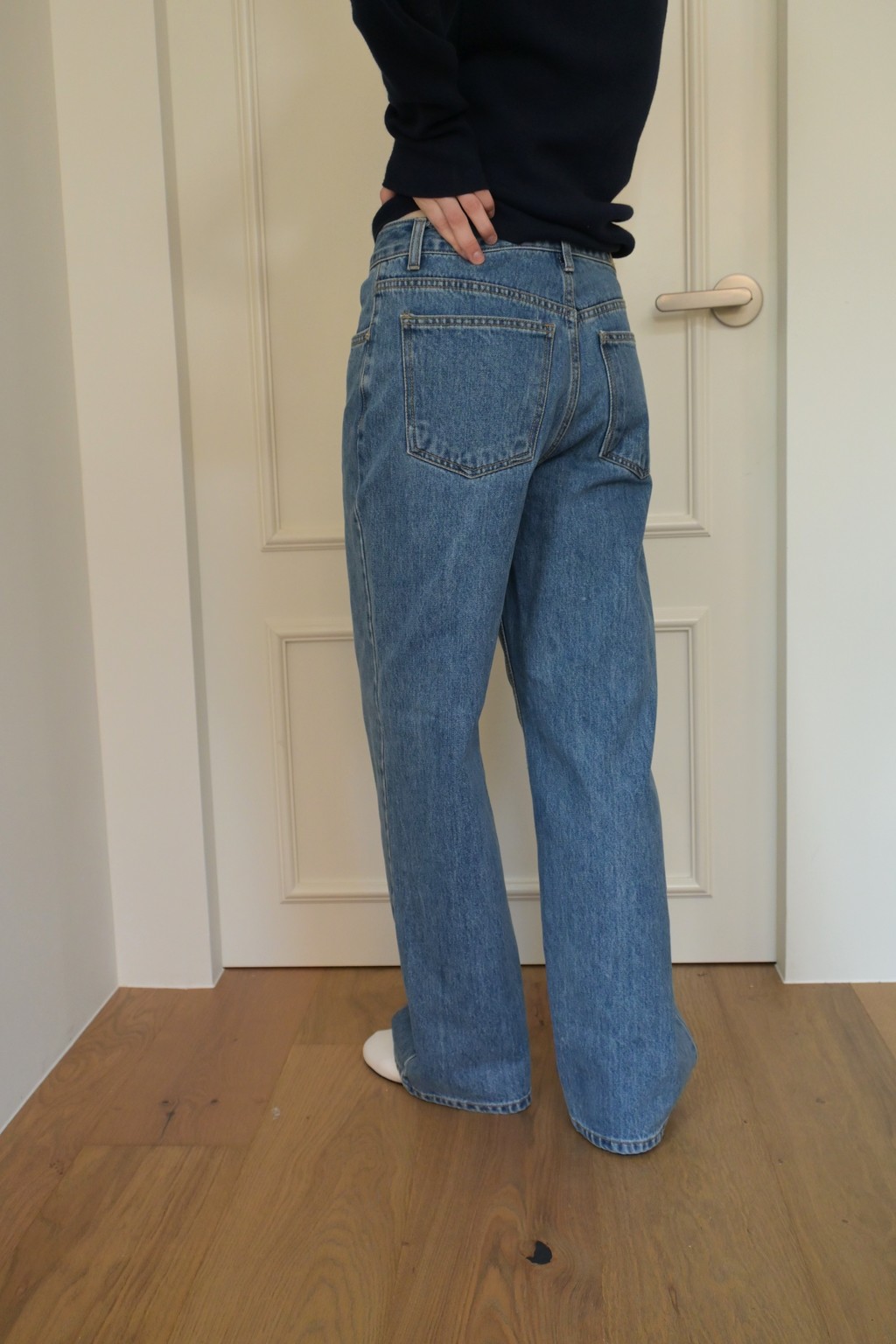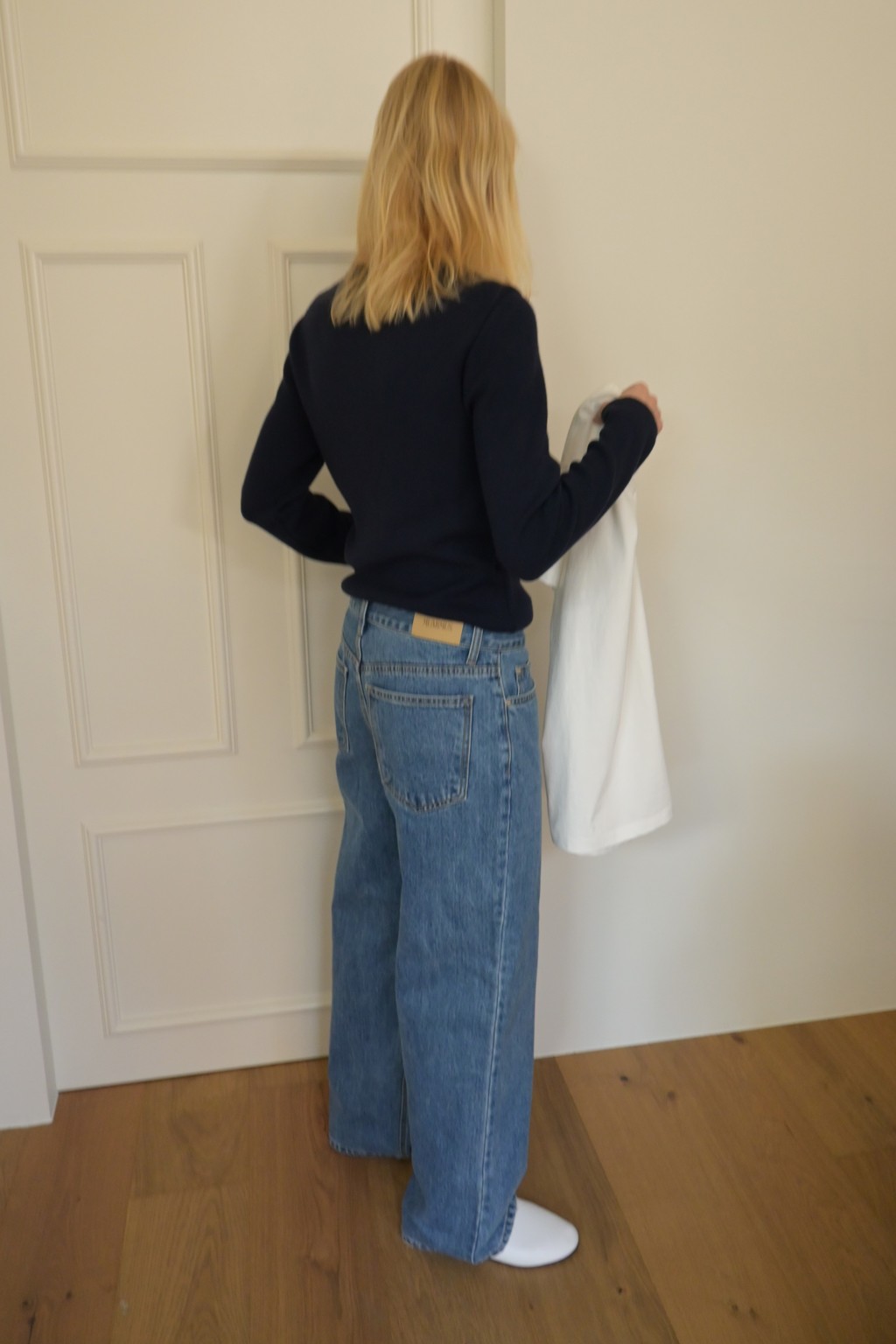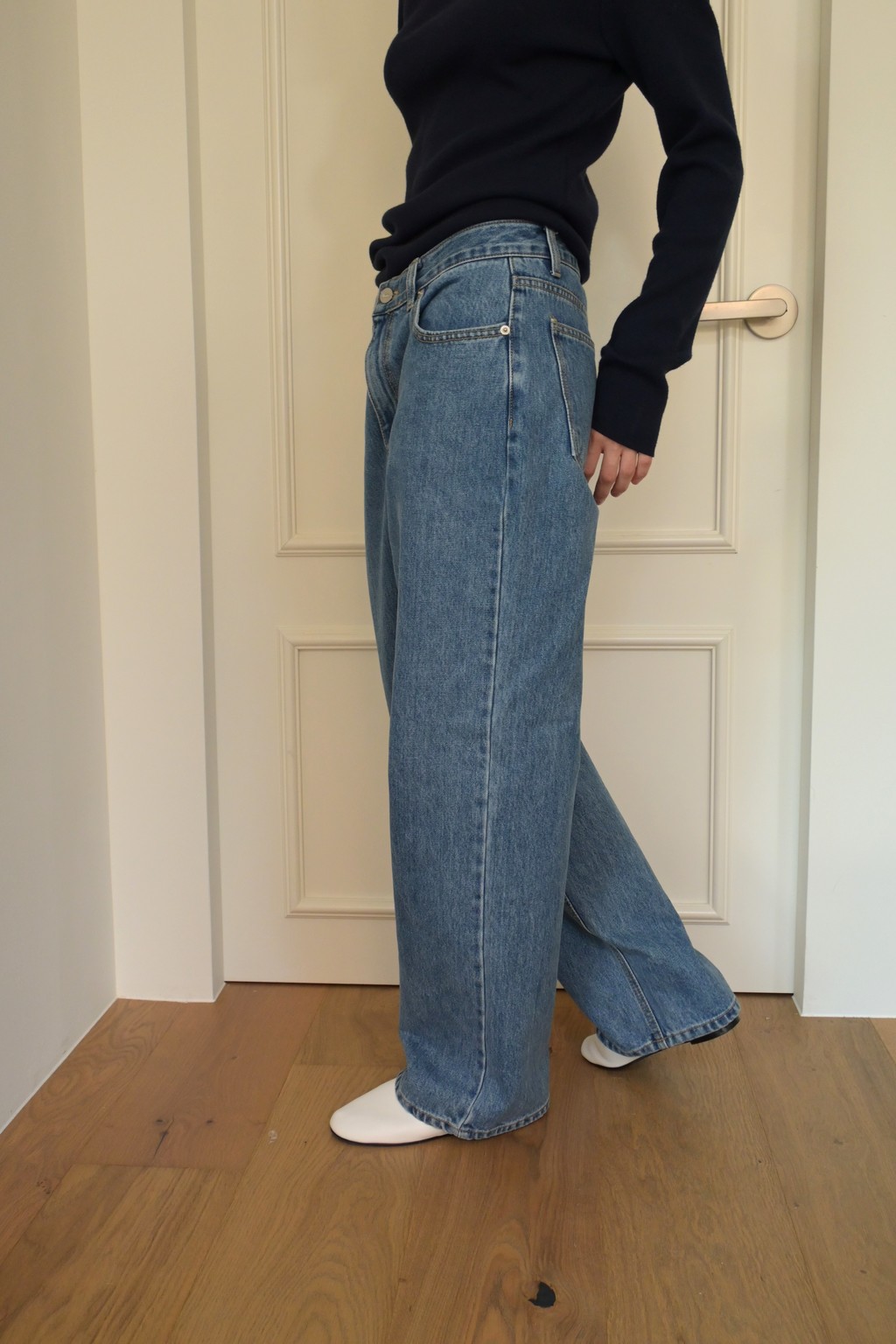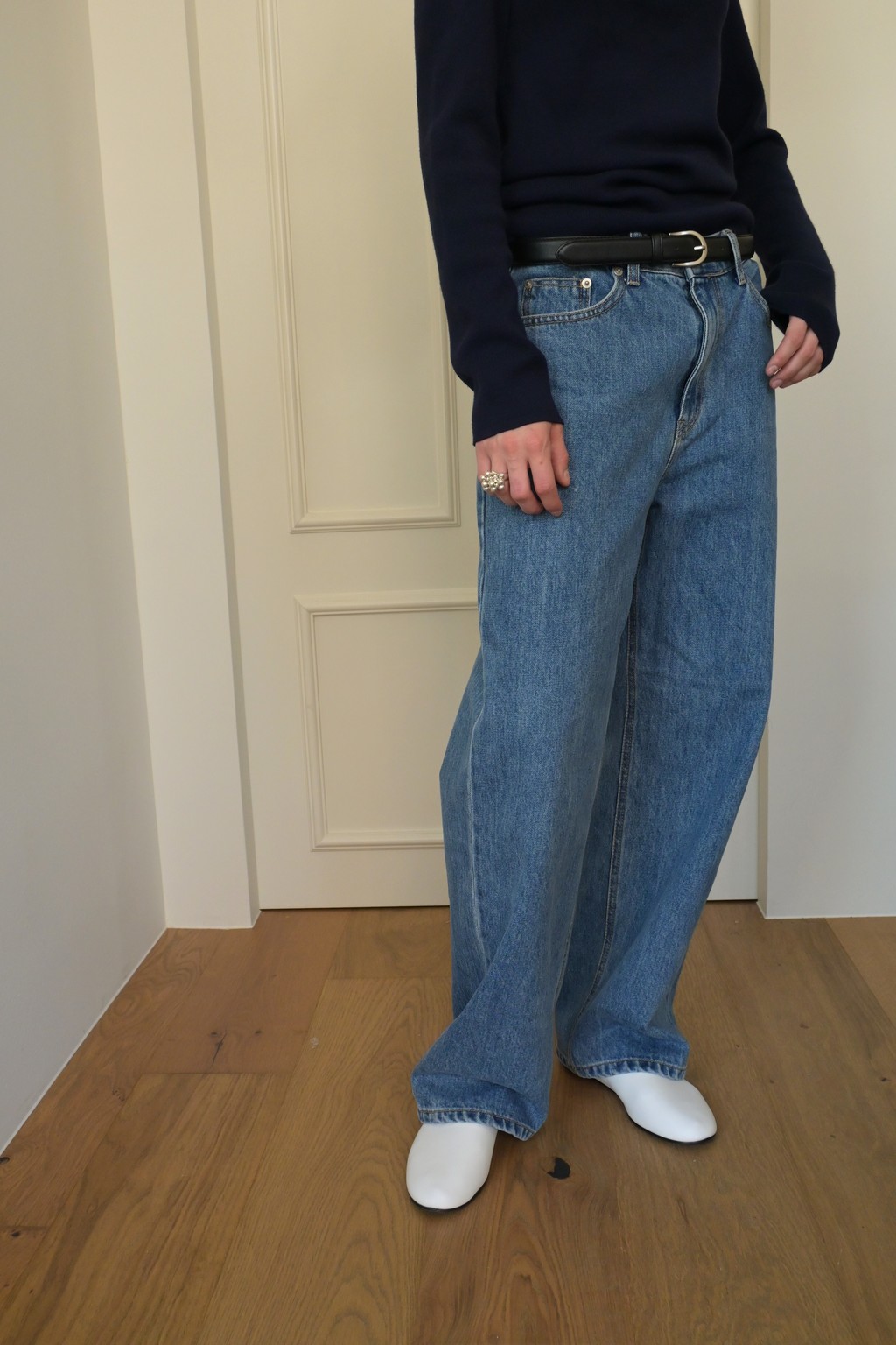 Muarmus’s signature wide denim in classic medium blue.