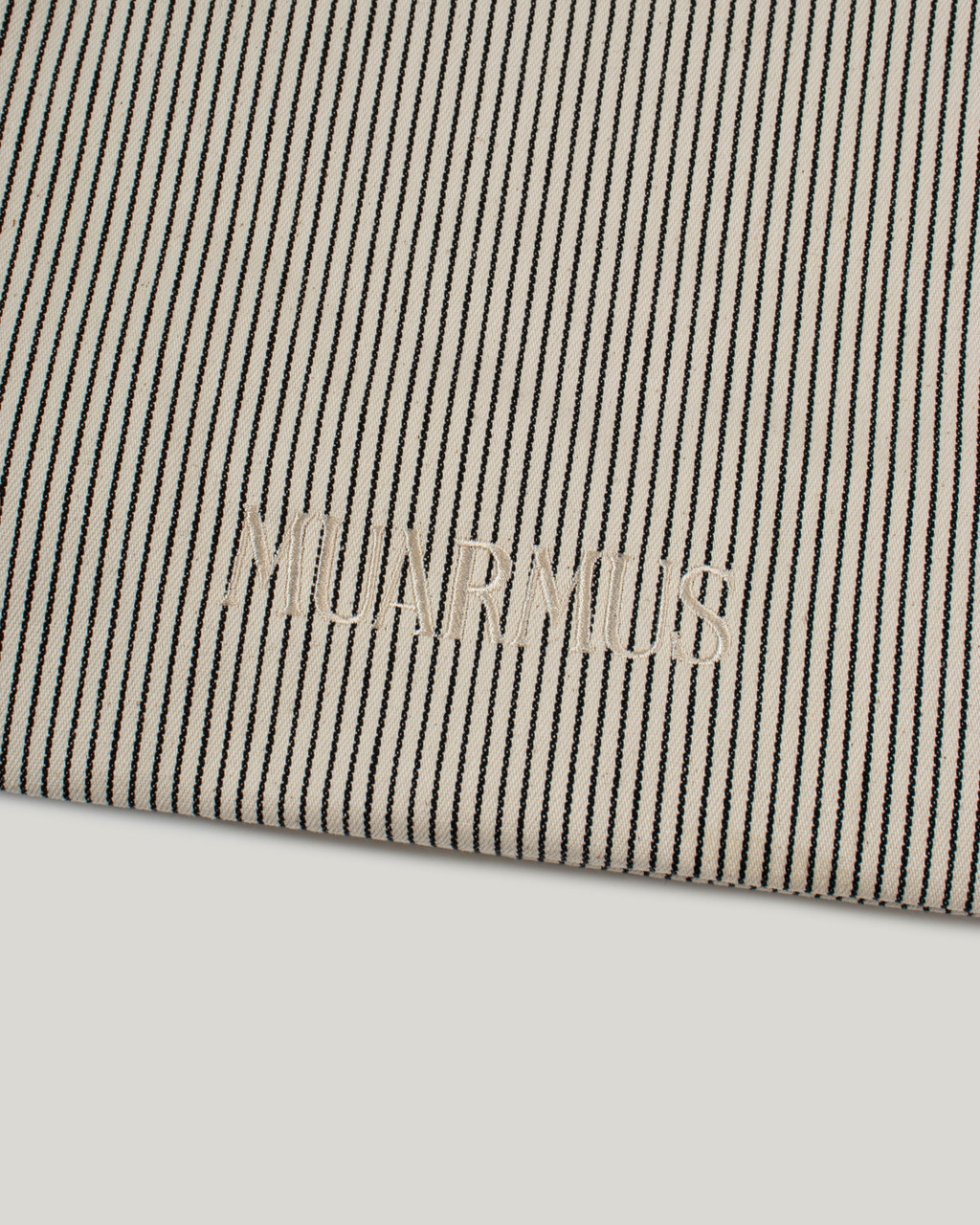 This striped eco-bag features MUARMUS’s embroidered logo on both sides. Crafted from durable cotton with a coated finish for added sturdiness, it has a versatile shoulder design for everyday use. The classic stripe pattern makes it a stylish accent as a secondary bag, and it comfortably accommodates essentials like a laptop, iPad, camera, or travel items.