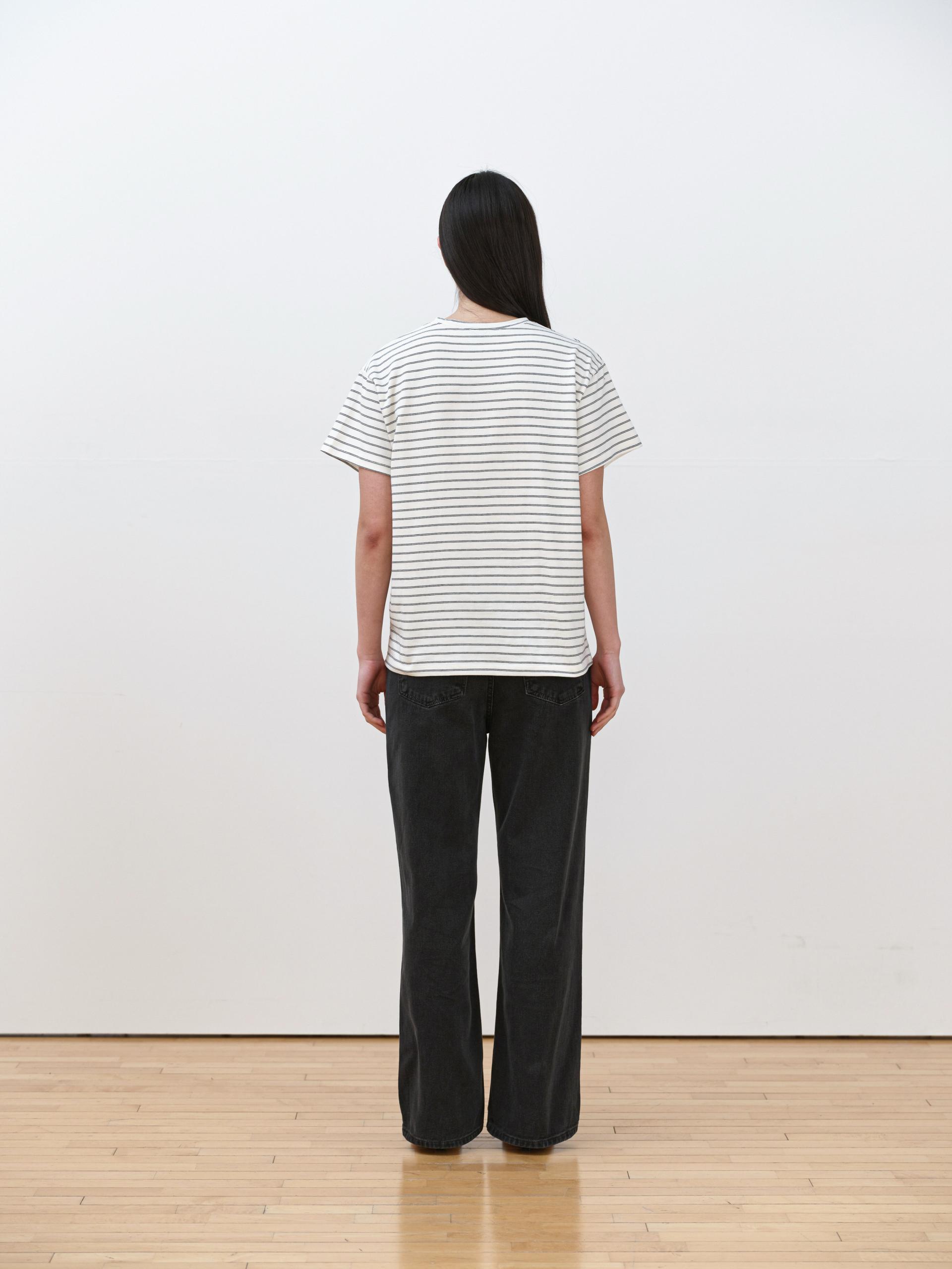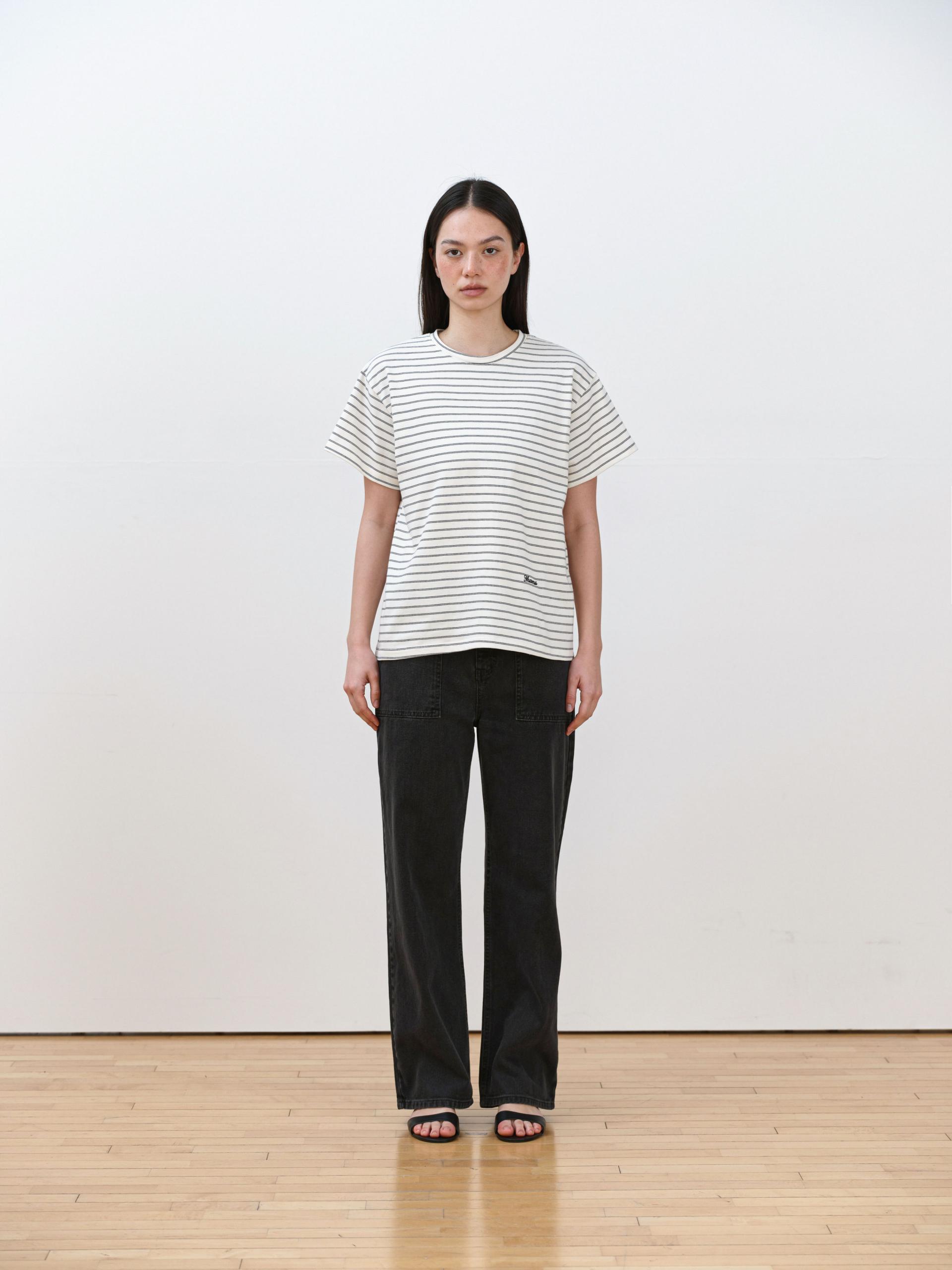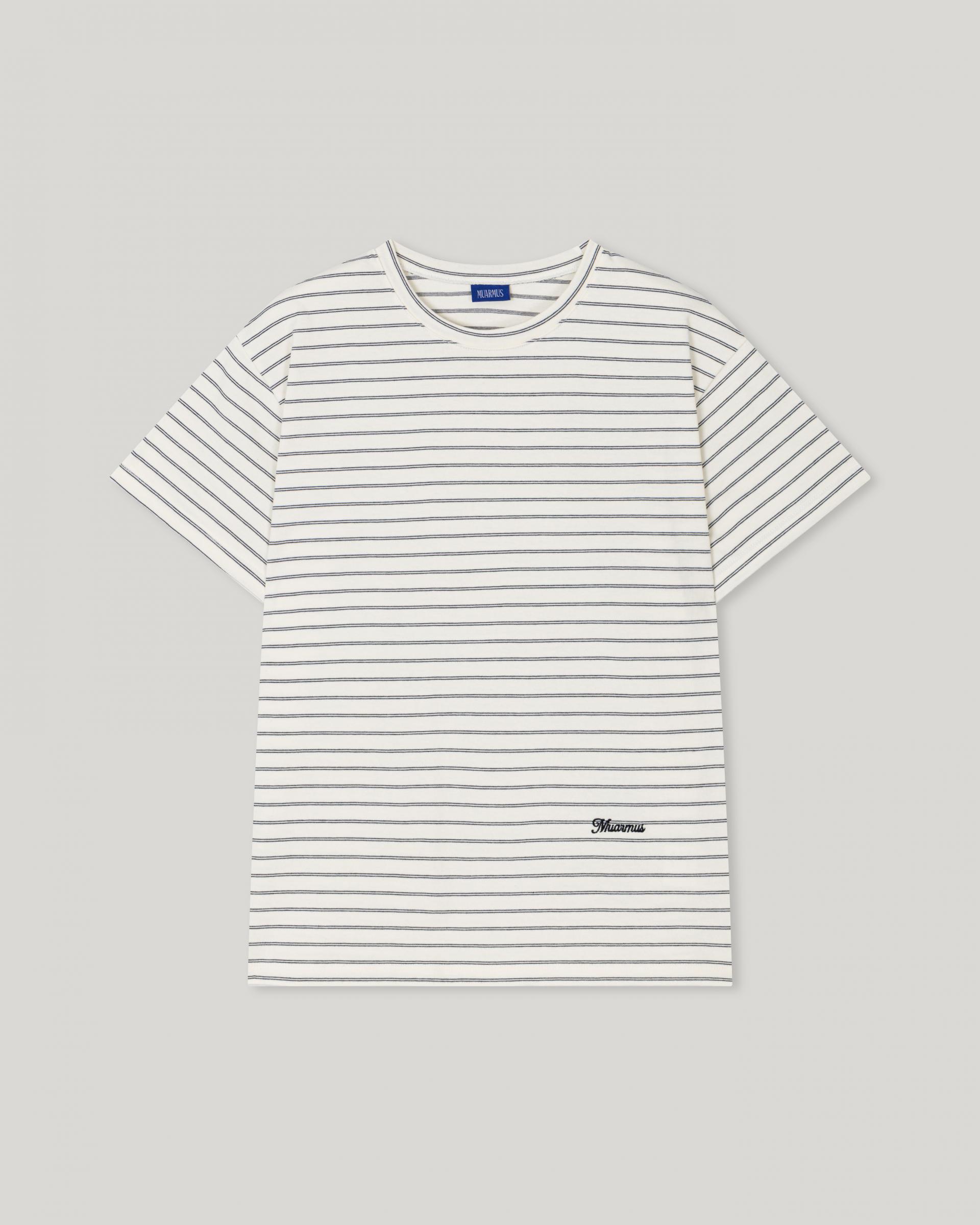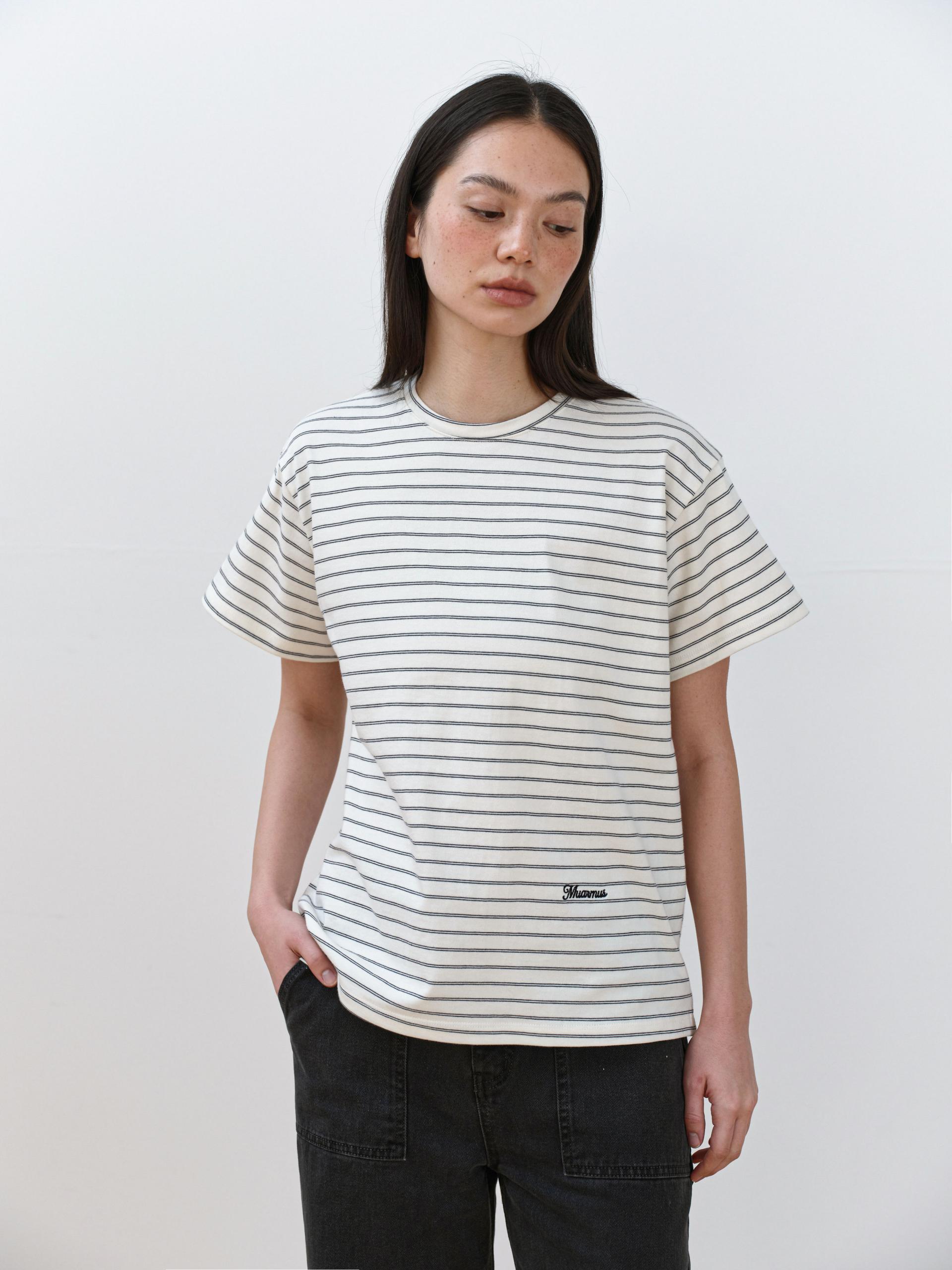 This striped T-shirt is made from high-density fabric, offering a firm and structured feel. It maintains a clean, well-balanced silhouette without losing its shape when worn, making it a reliable choice for everyday wear.