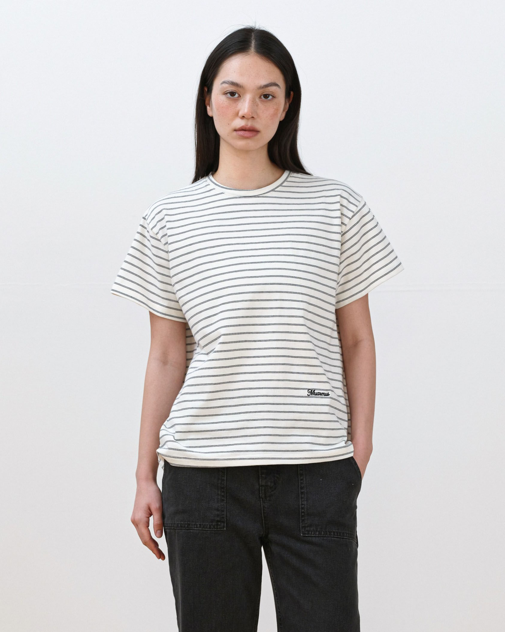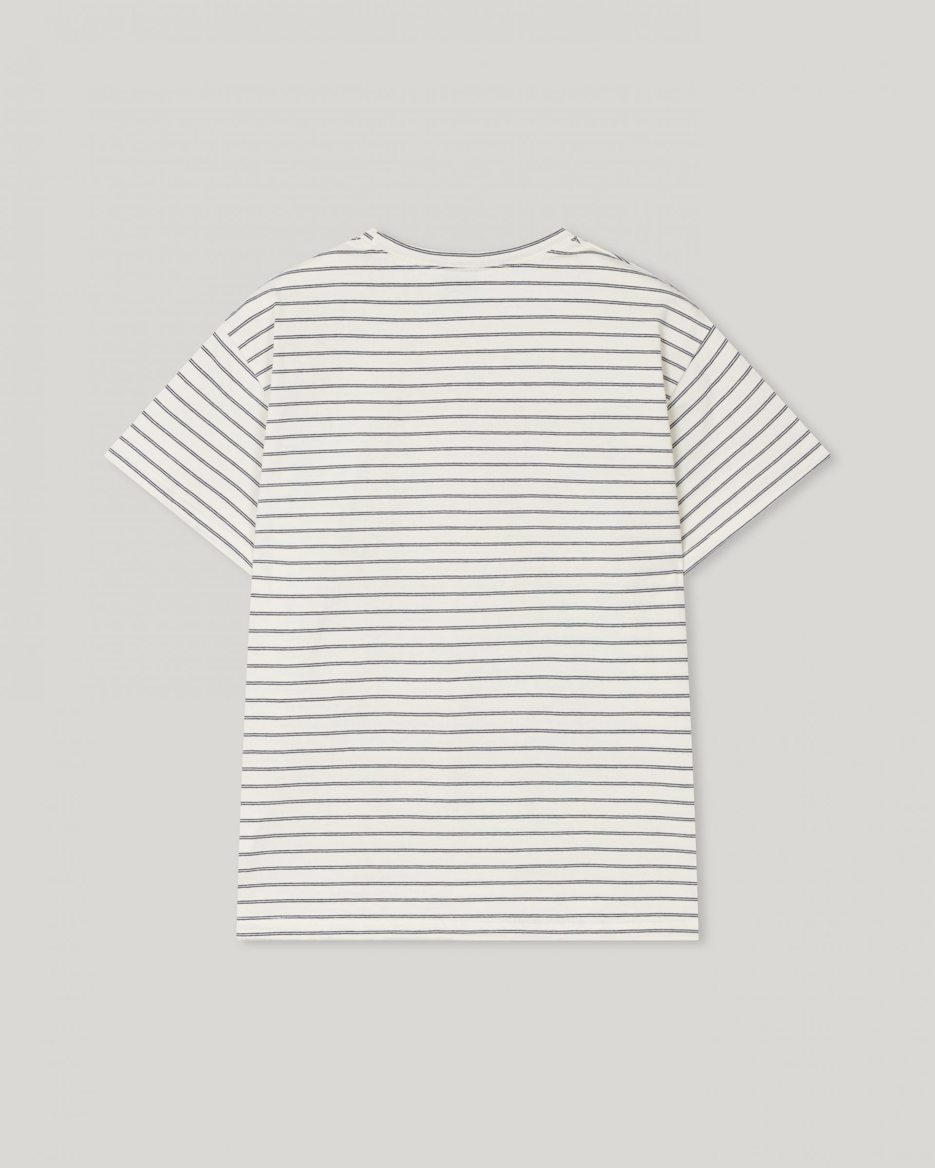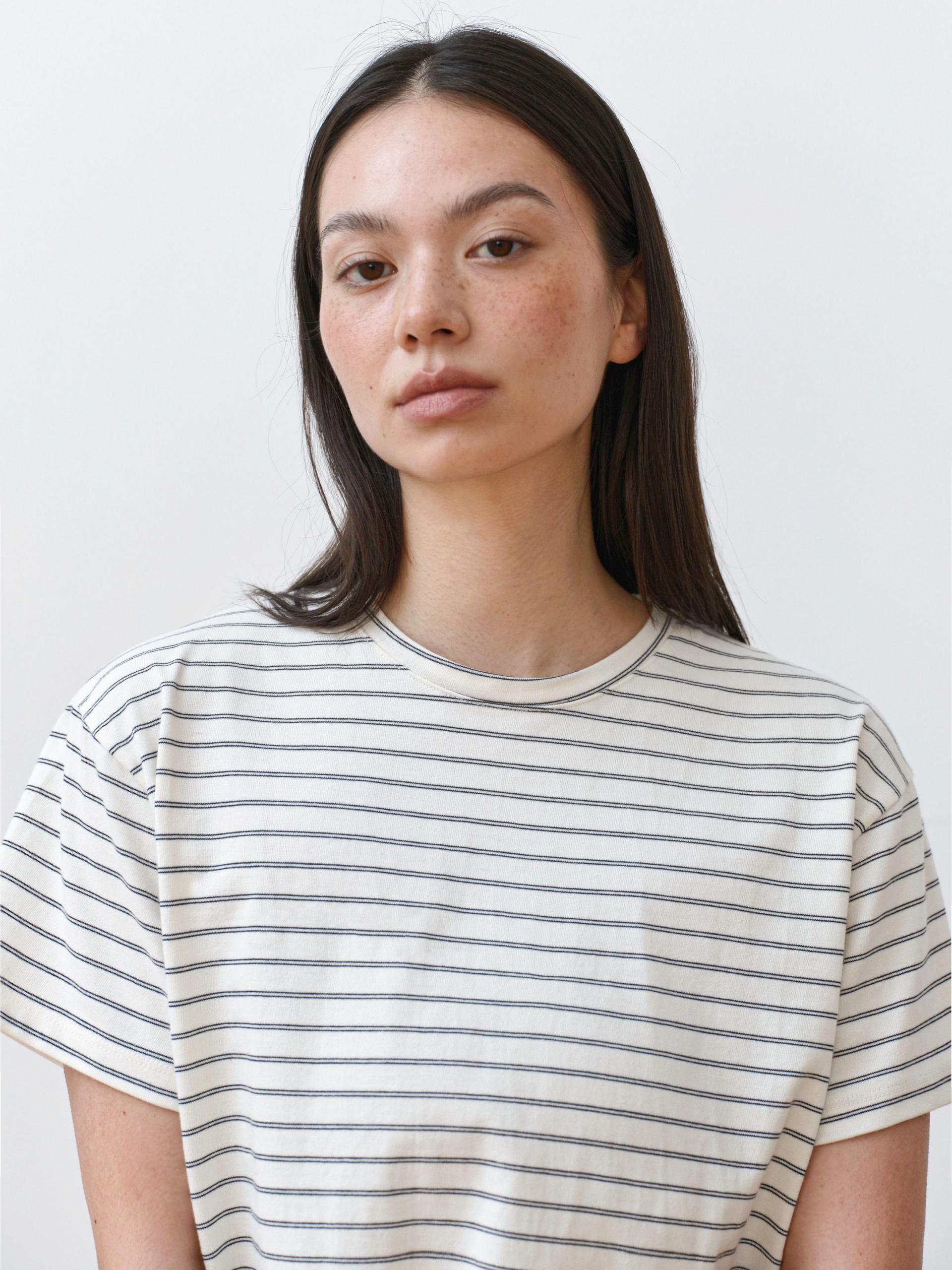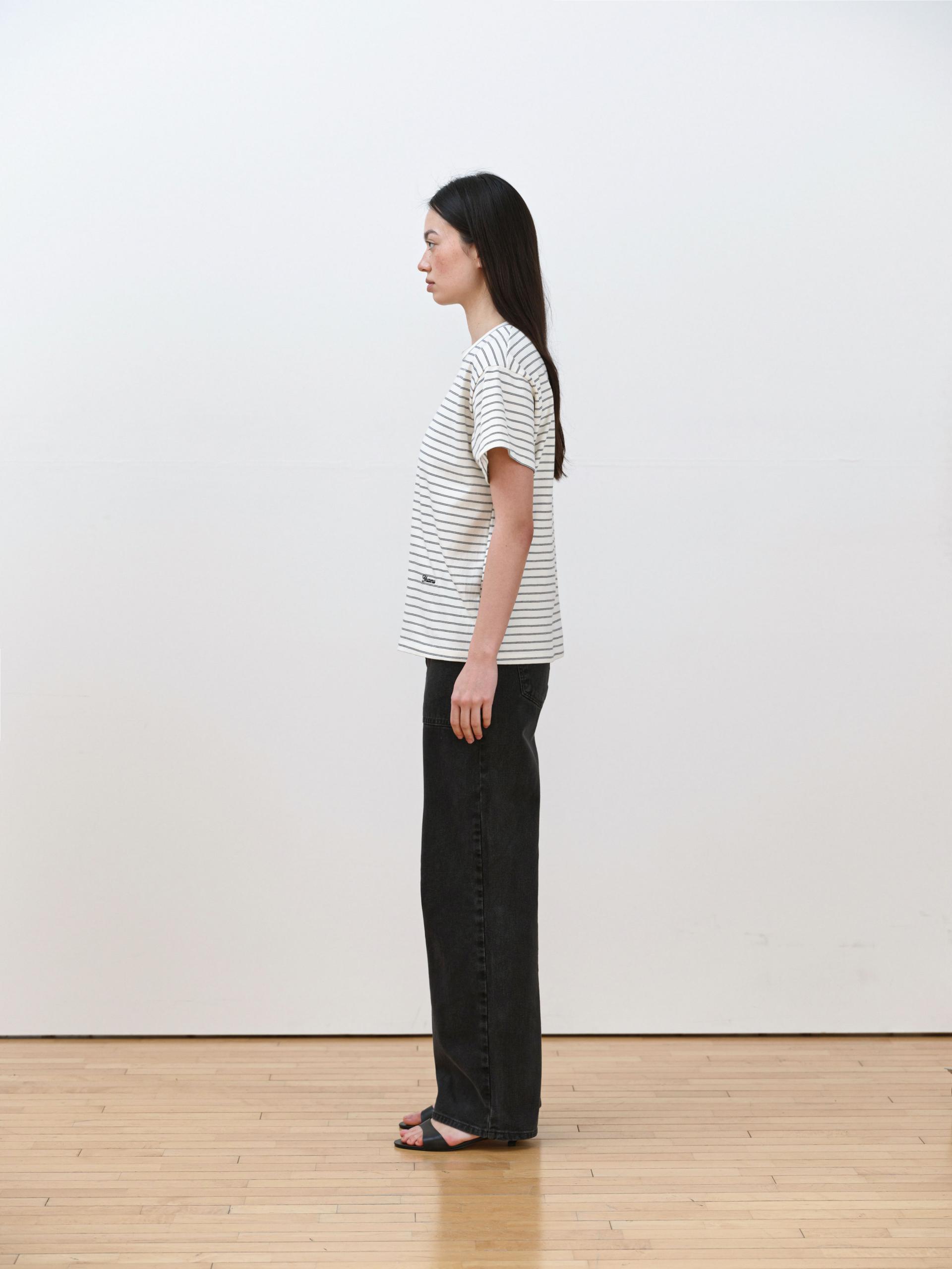 This striped T-shirt is made from high-density fabric, offering a firm and structured feel. It maintains a clean, well-balanced silhouette without losing its shape when worn, making it a reliable choice for everyday wear.