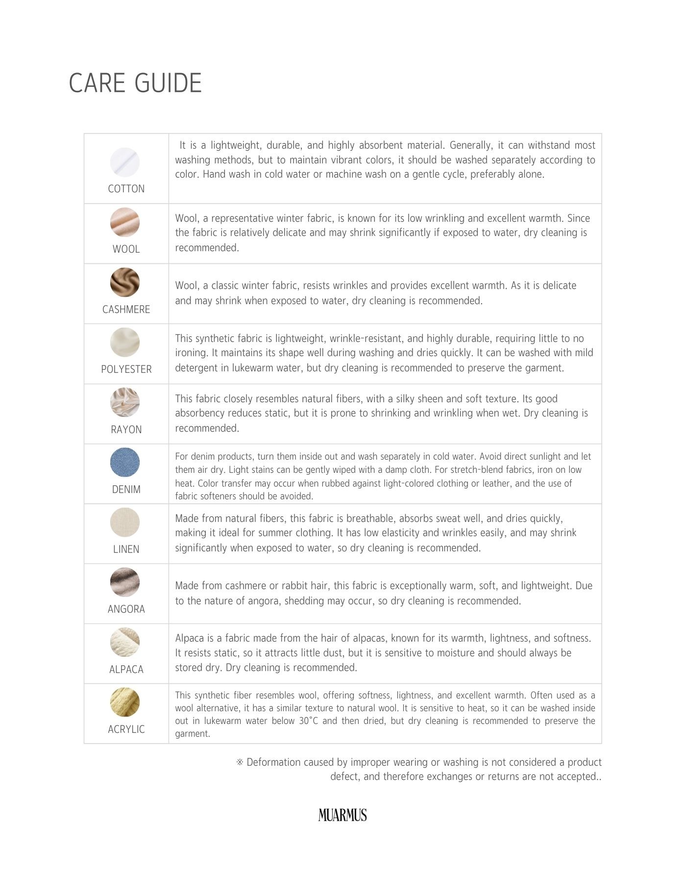 Due to the characteristics of natural materials, exposure to sunlight or sweat may cause discoloration, so please avoid direct sunlight during wear and storage. If the product becomes creased, avoid steaming and instead gently iron at a low temperature with a light cloth placed over it.