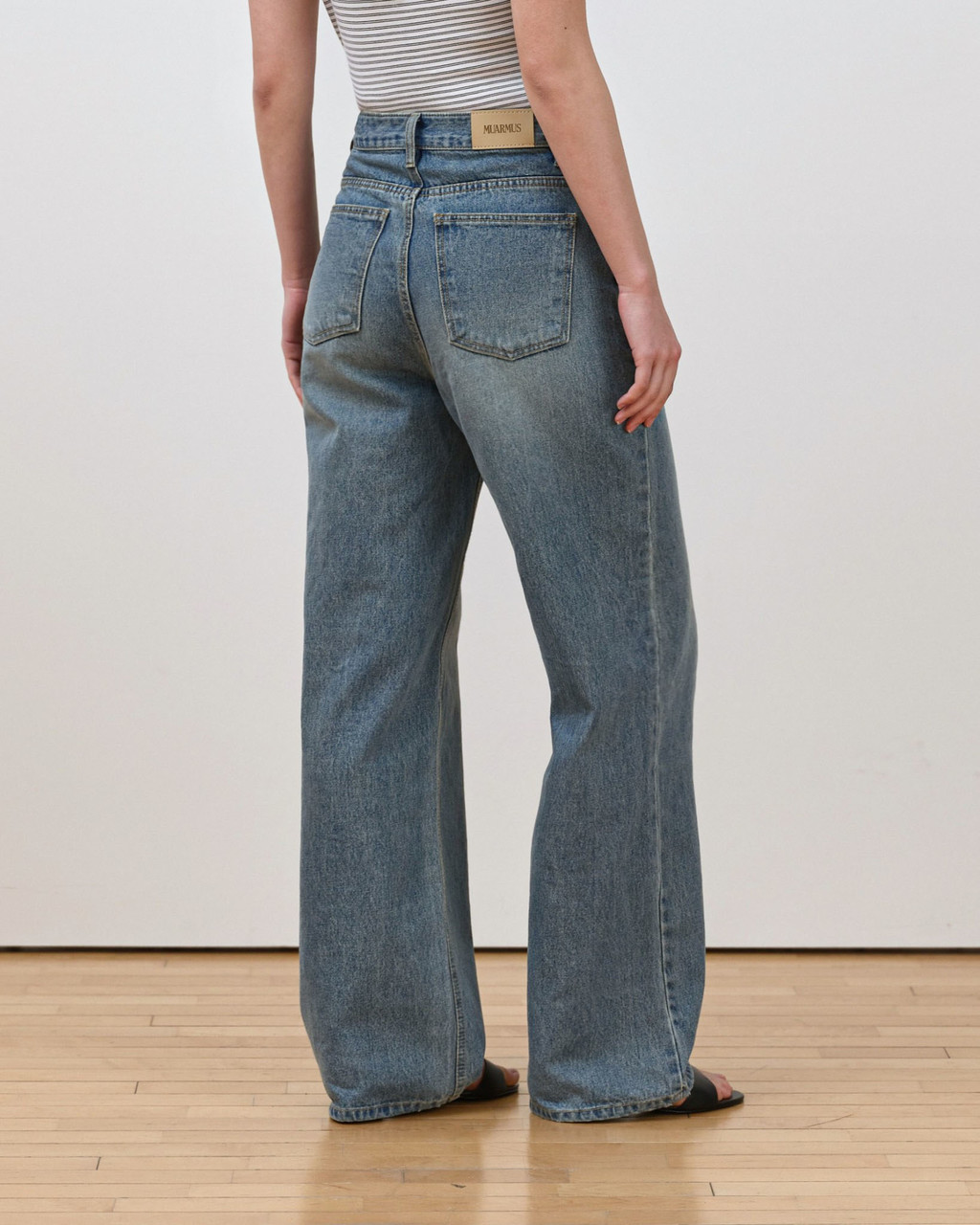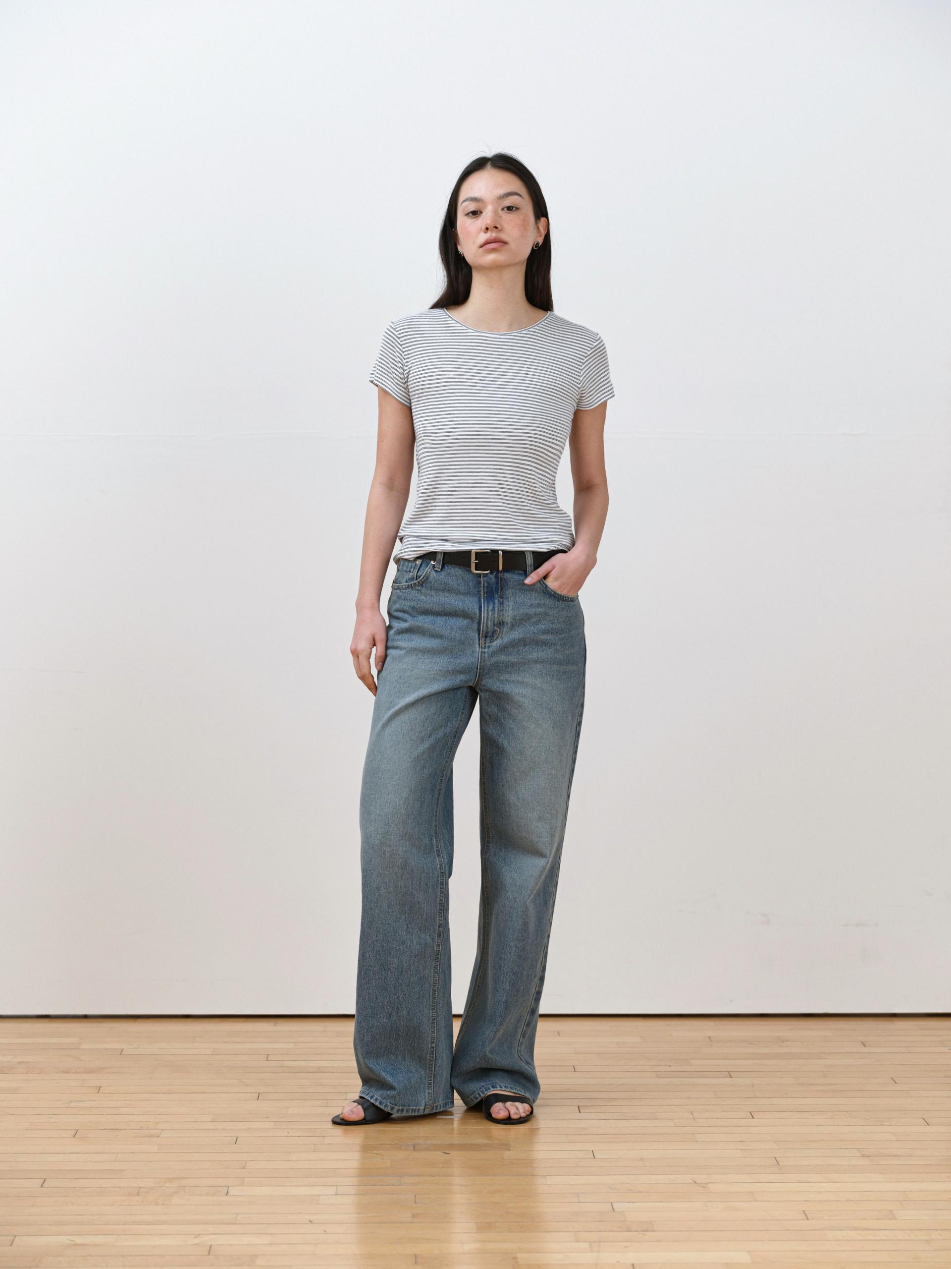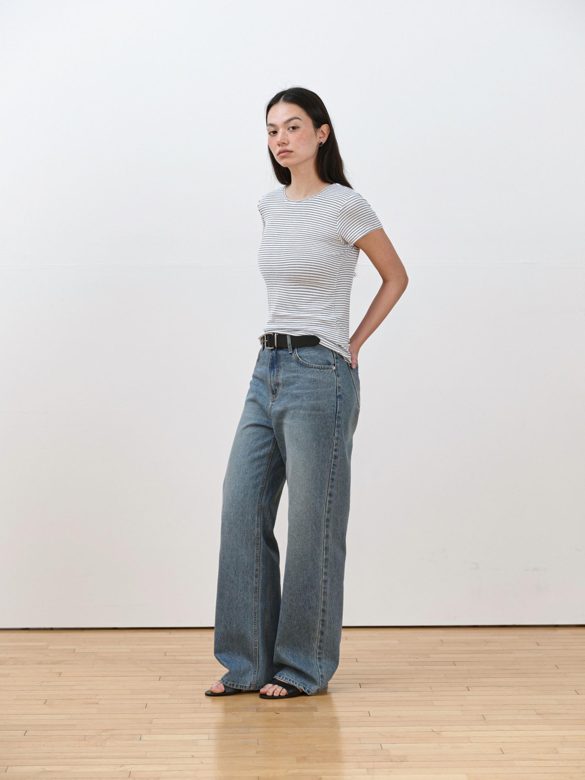 The smooth yet sturdy fabric keeps the overall line clean and well-defined, making it easy to style for both everyday looks and casual outings. A refined wide denim with an elevated finish, it brings a polished touch to your daily wardrobe.