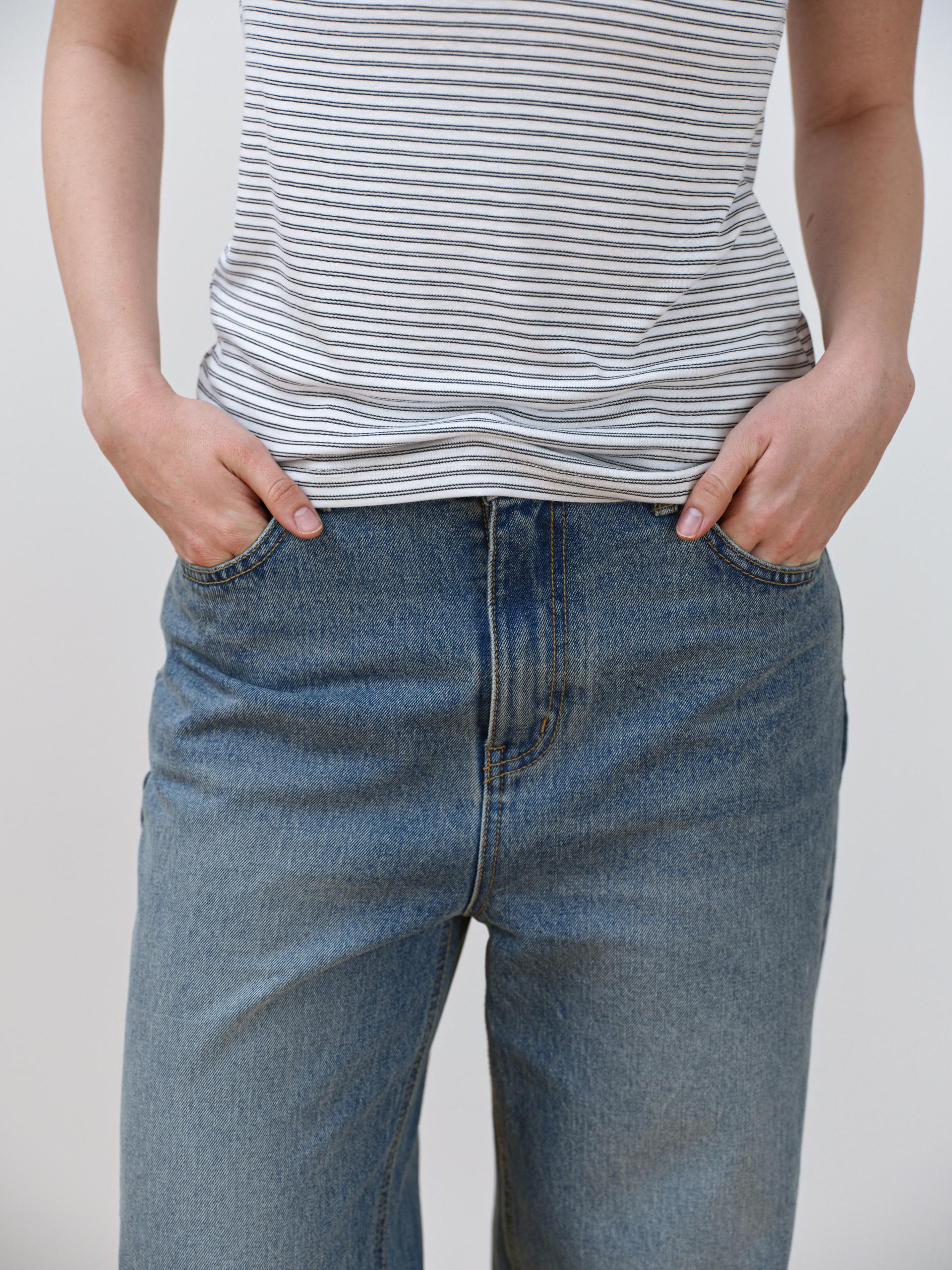 The silhouette combines a straight line with a relaxed wide fit, gently draping along the leg to create balanced and flattering proportions.