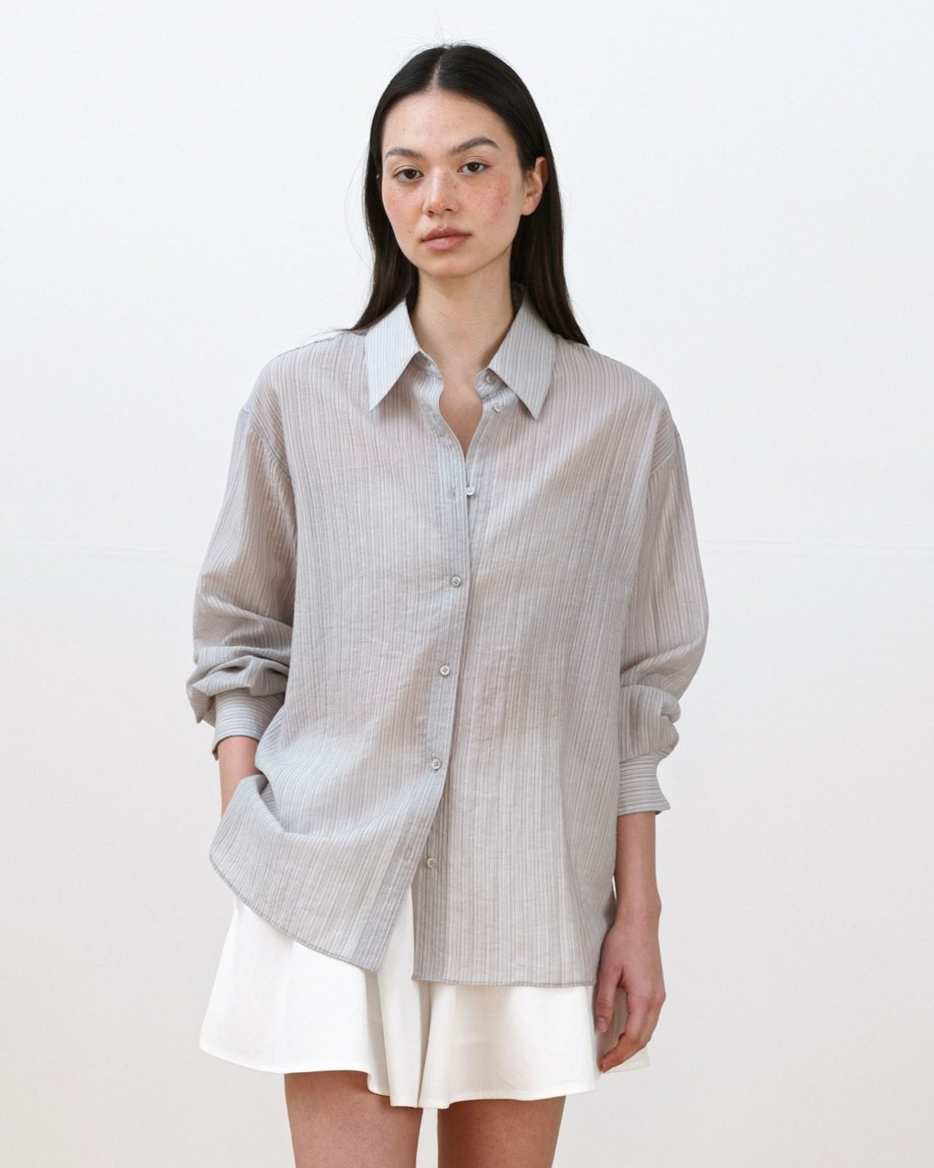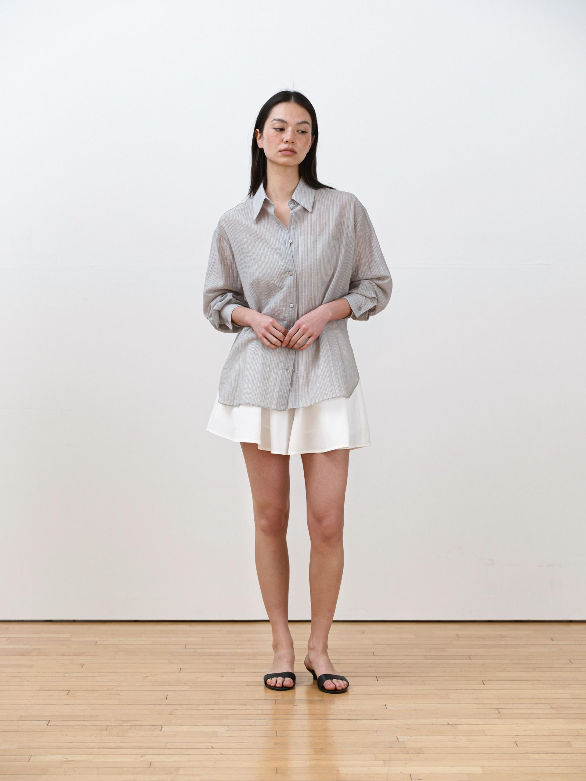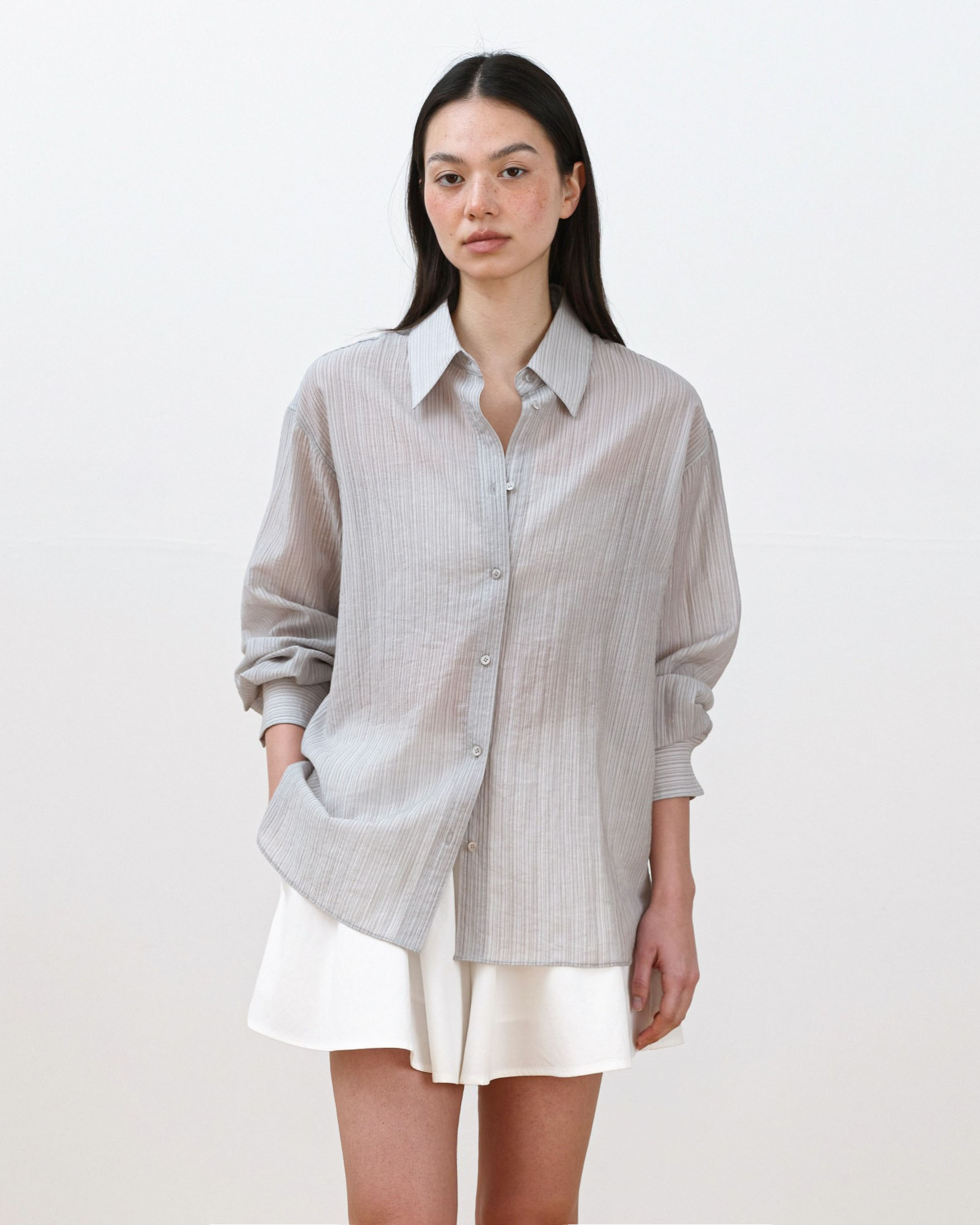 A refined shirt featuring a naturally sheer texture combined with a subtle striped pattern.
