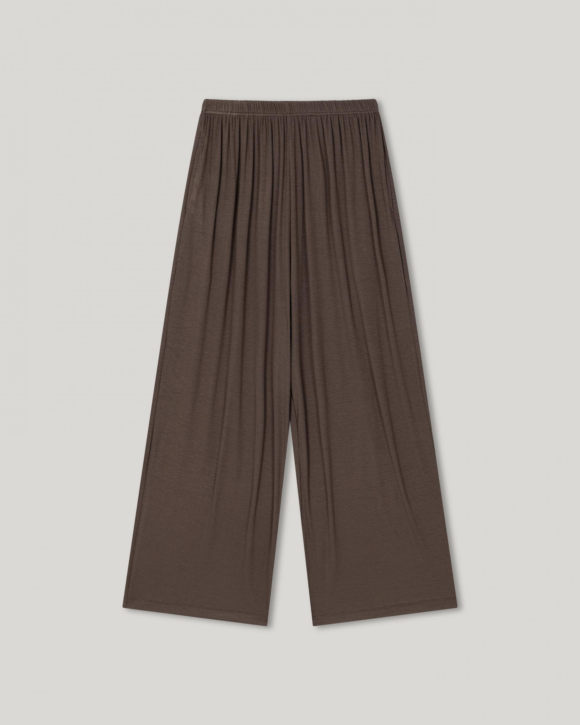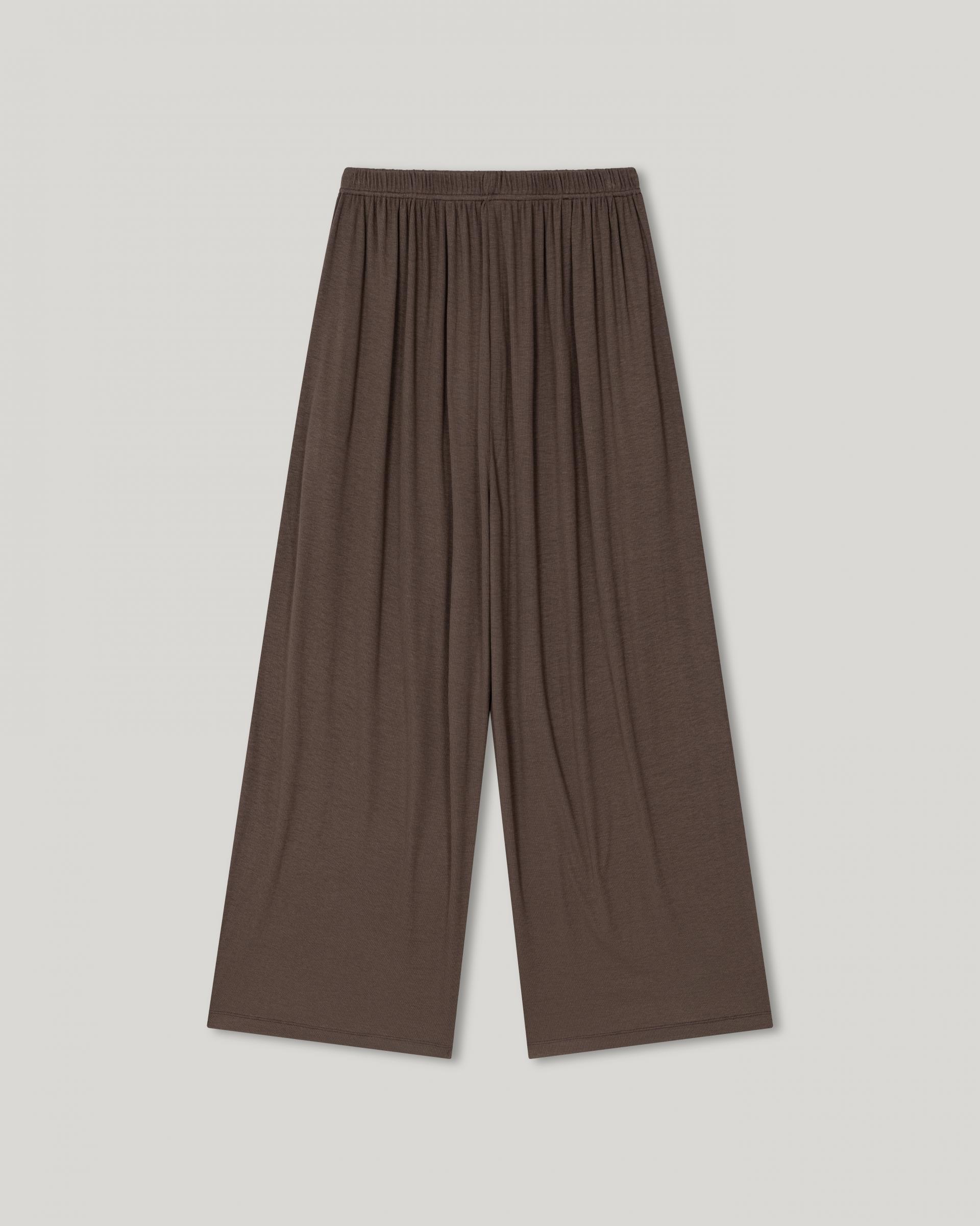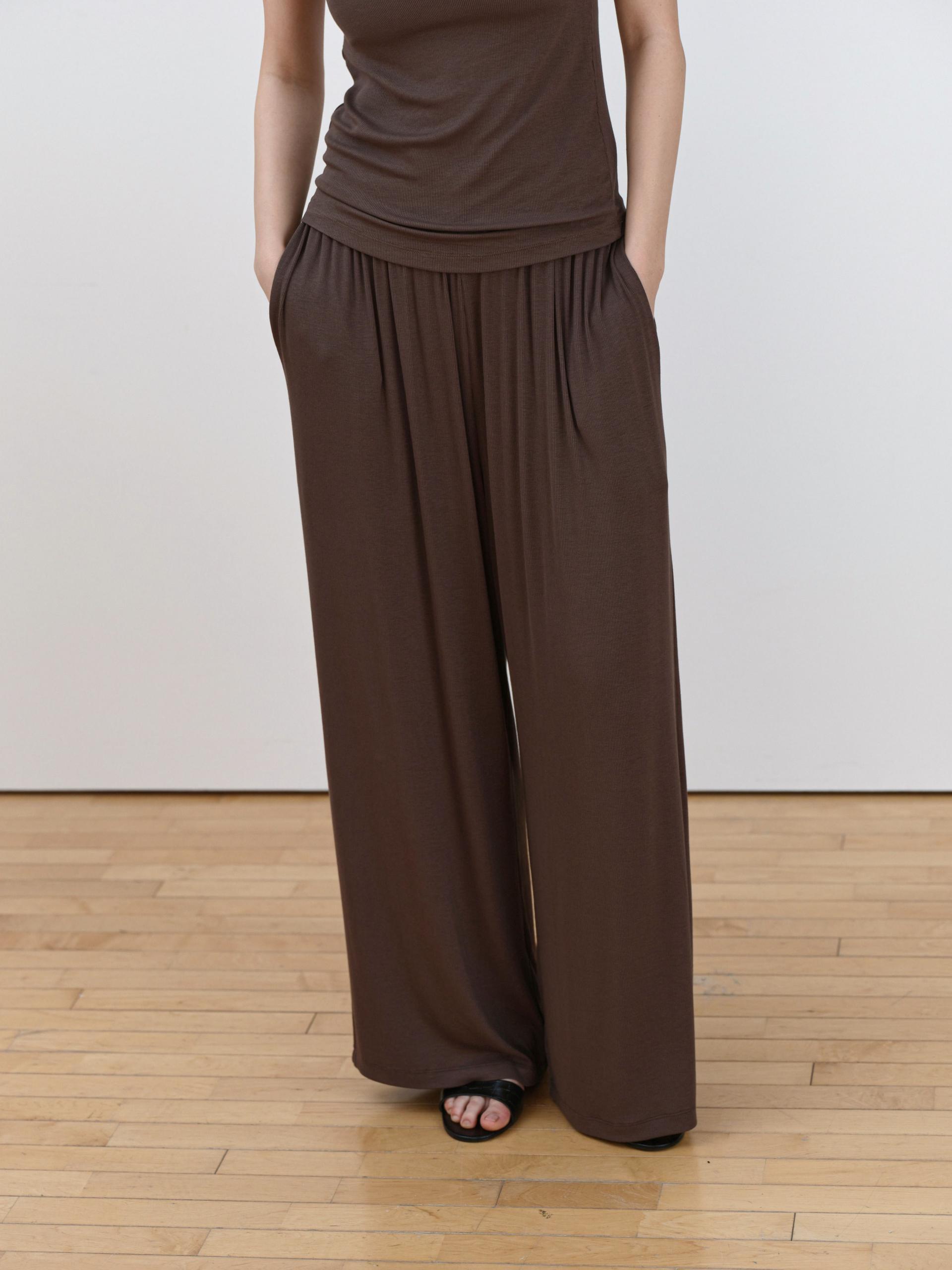 The relaxed wide silhouette naturally flatters and covers the lower body, while the fluid drape enhances movement with an easy yet refined feel. Finished with clean details suitable for lounge-casual styling, these pants work beautifully as daily wear and create an even more stylish look when paired as a set.