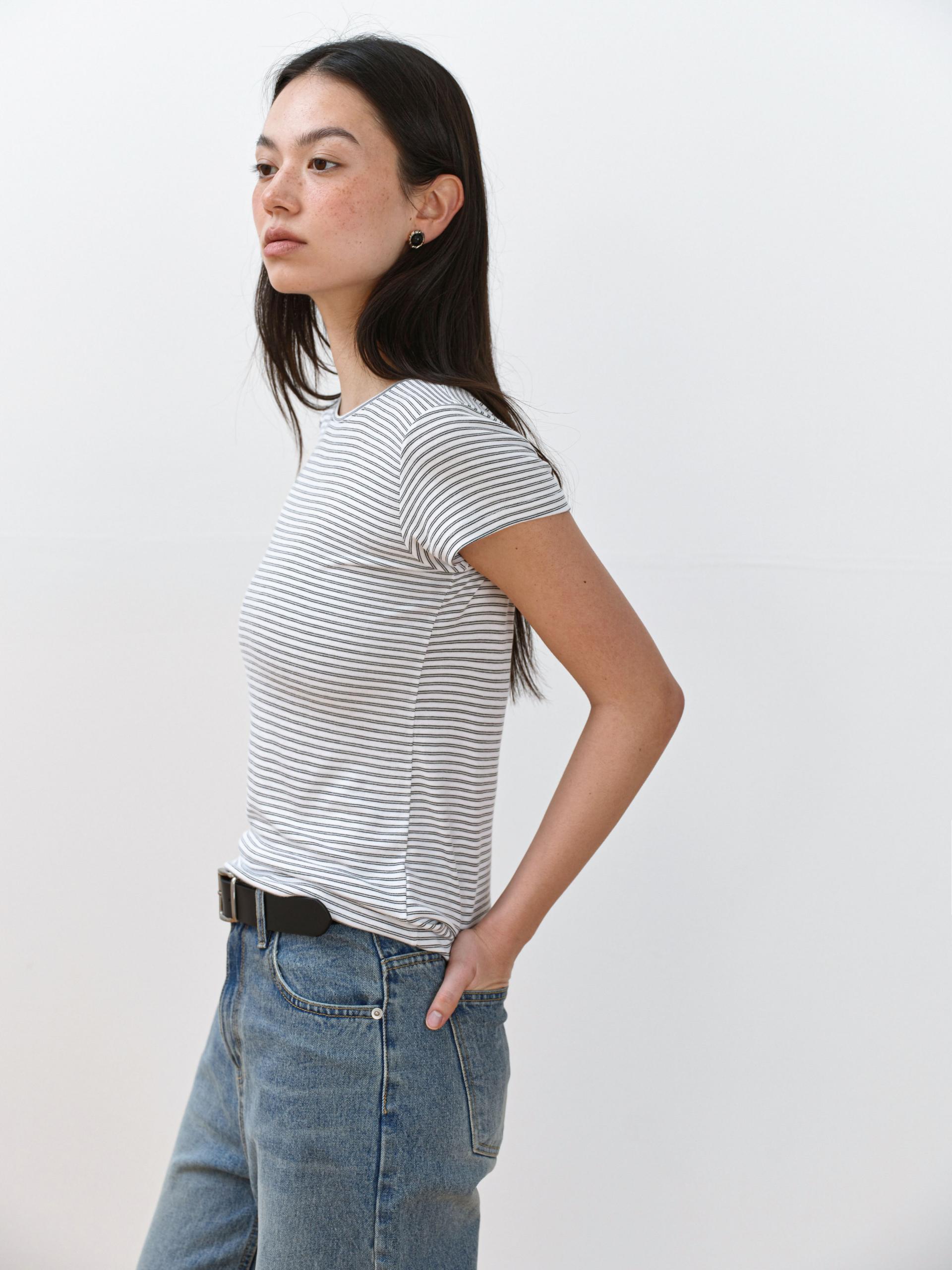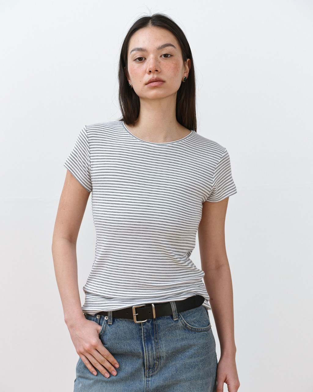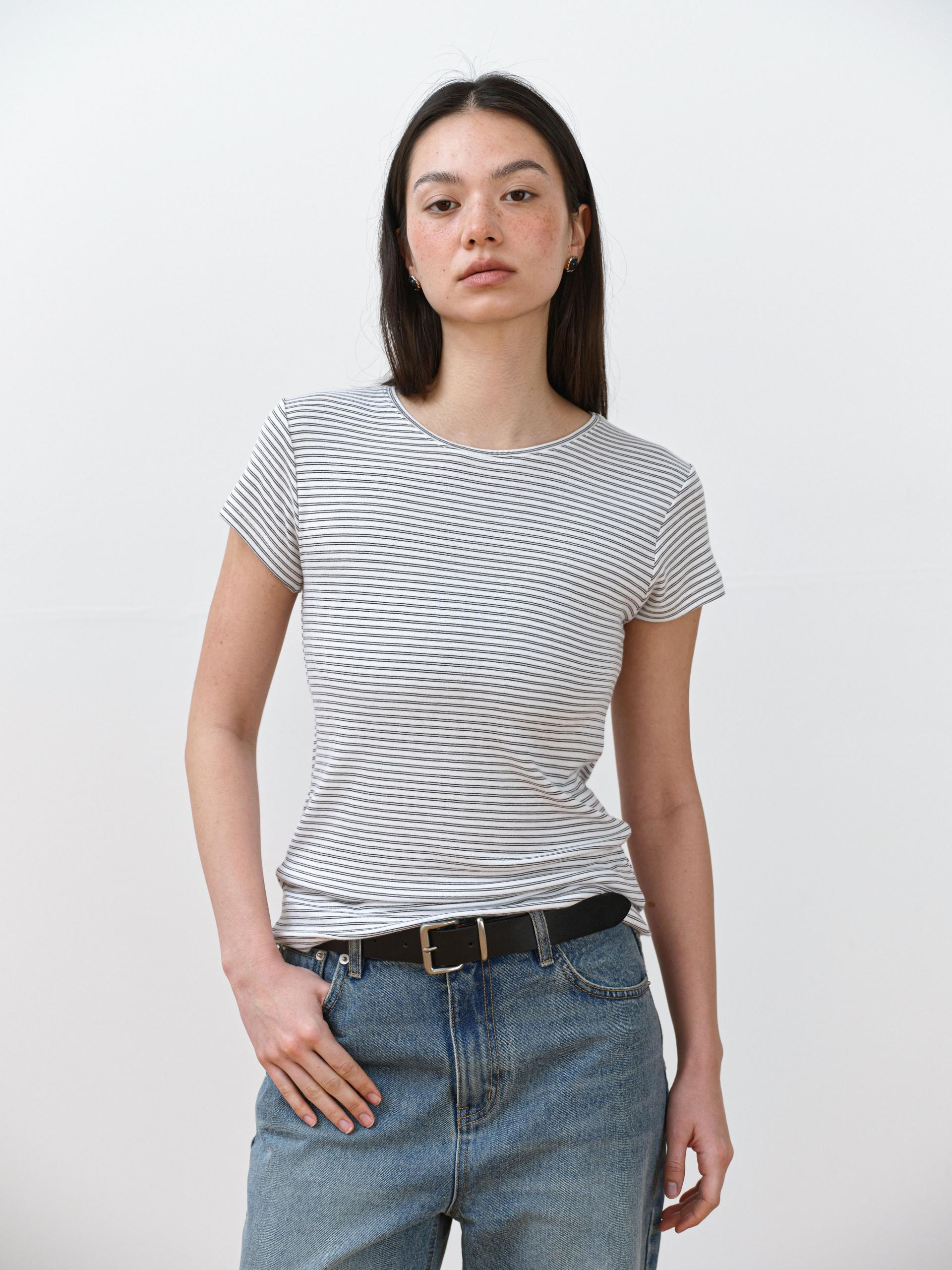 A slim-fit striped T-shirt crafted from a softly flowing rayon-blend fabric.