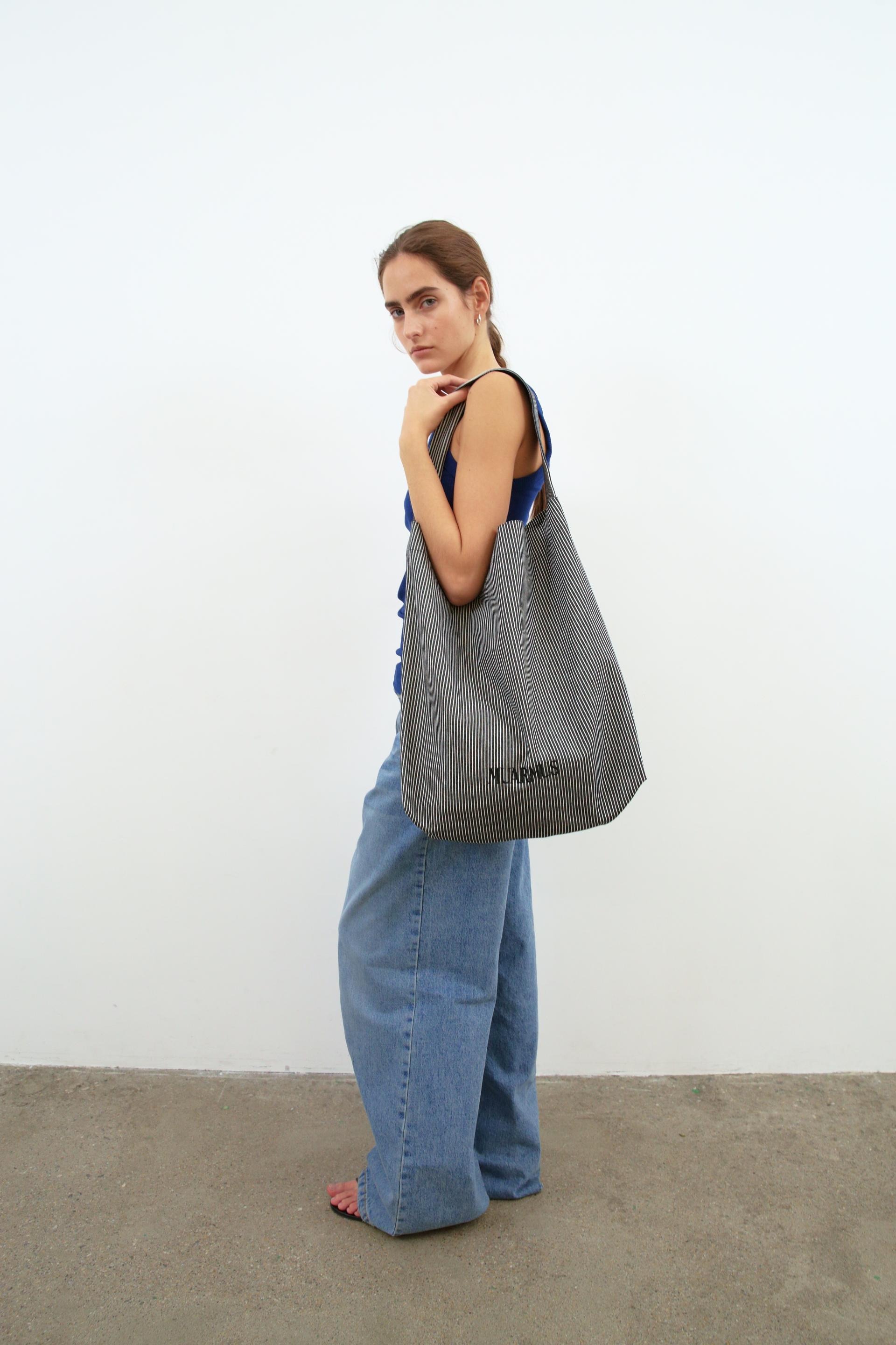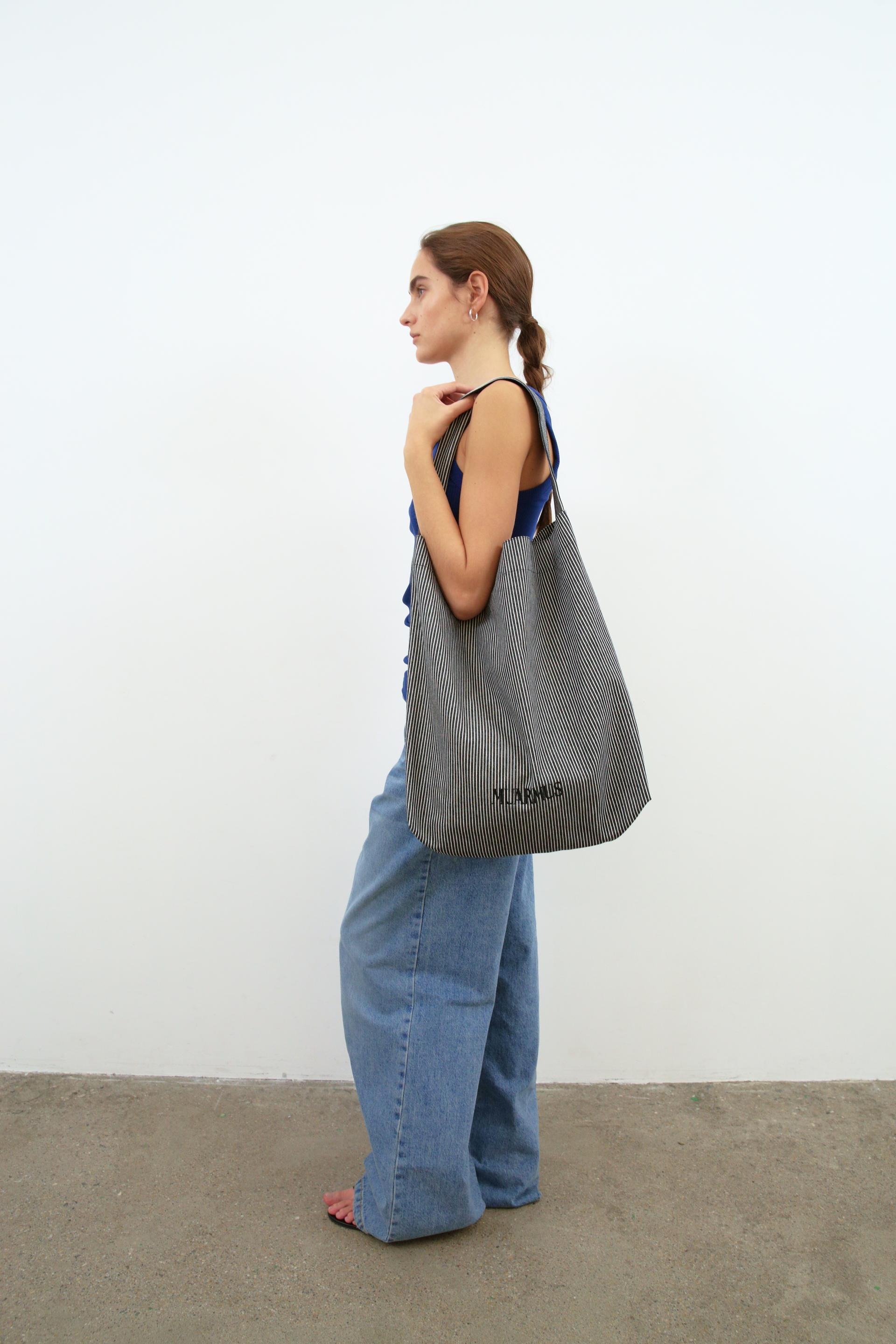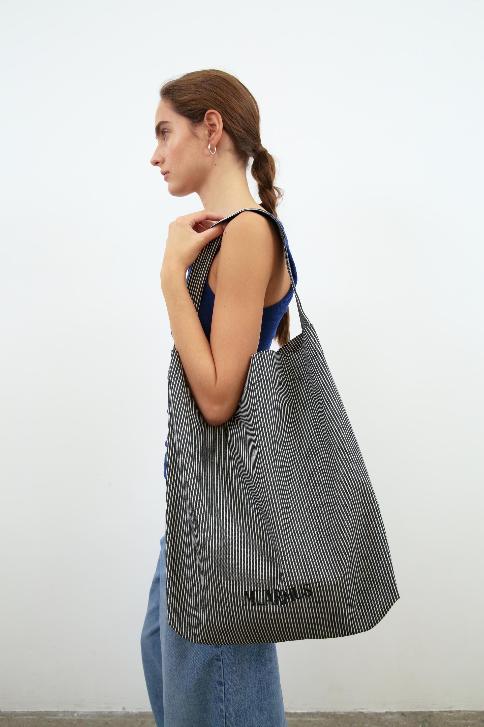 This striped eco-bag features MUARMUS’s embroidered logo on both sides. Crafted from durable cotton with a coated finish for added sturdiness, it has a versatile shoulder design for everyday use. The classic stripe pattern makes it a stylish accent as a secondary bag, and it comfortably accommodates essentials like a laptop, iPad, camera, or travel items.