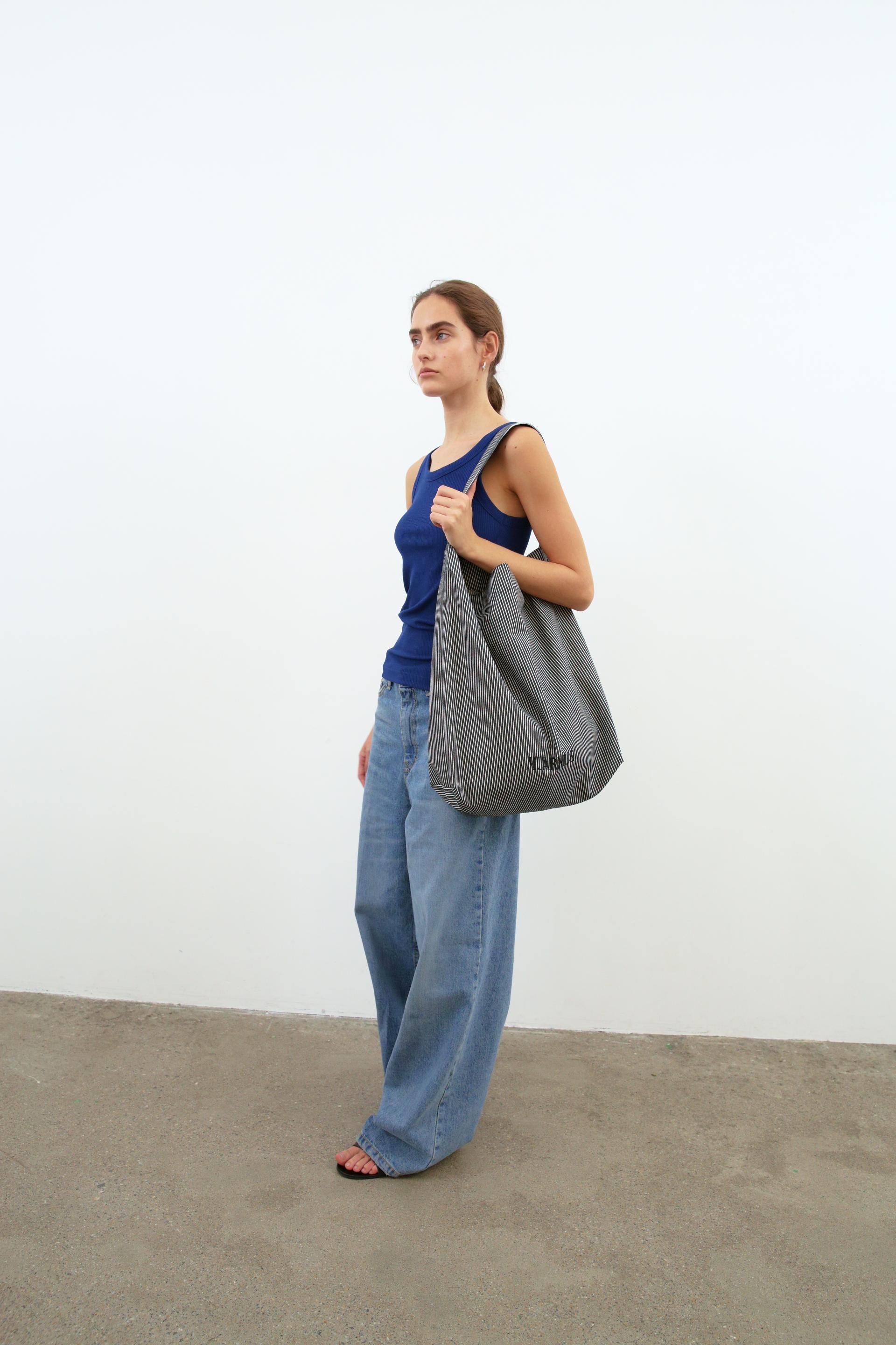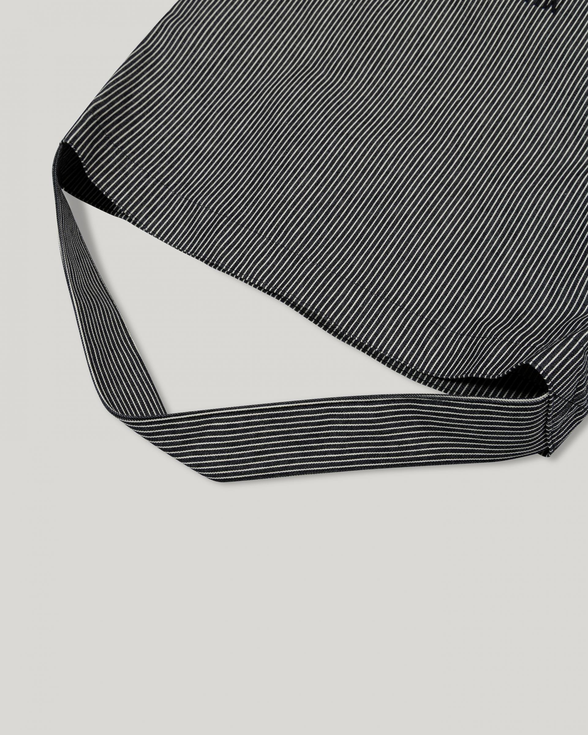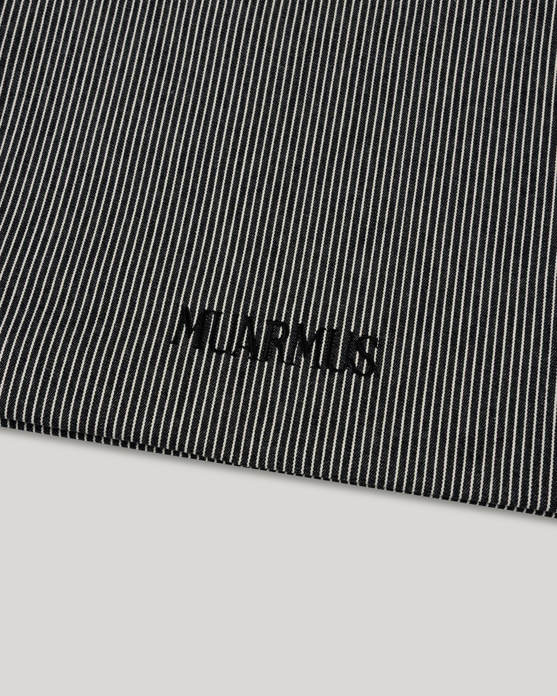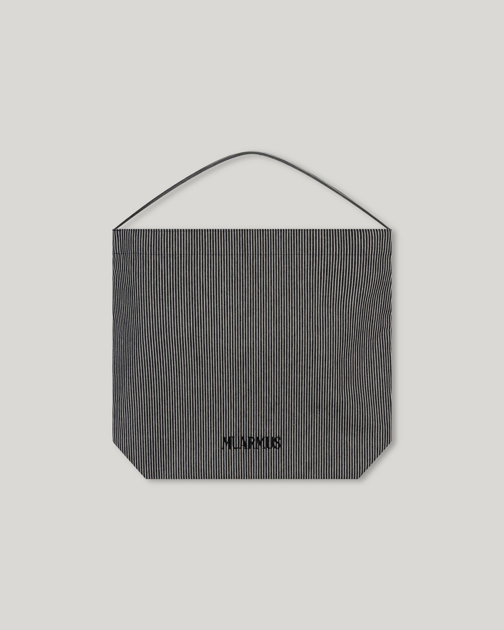This striped eco-bag features MUARMUS’s embroidered logo on both sides. Crafted from durable cotton with a coated finish for added sturdiness, it has a versatile shoulder design for everyday use. The classic stripe pattern makes it a stylish accent as a secondary bag, and it comfortably accommodates essentials like a laptop, iPad, camera, or travel items.